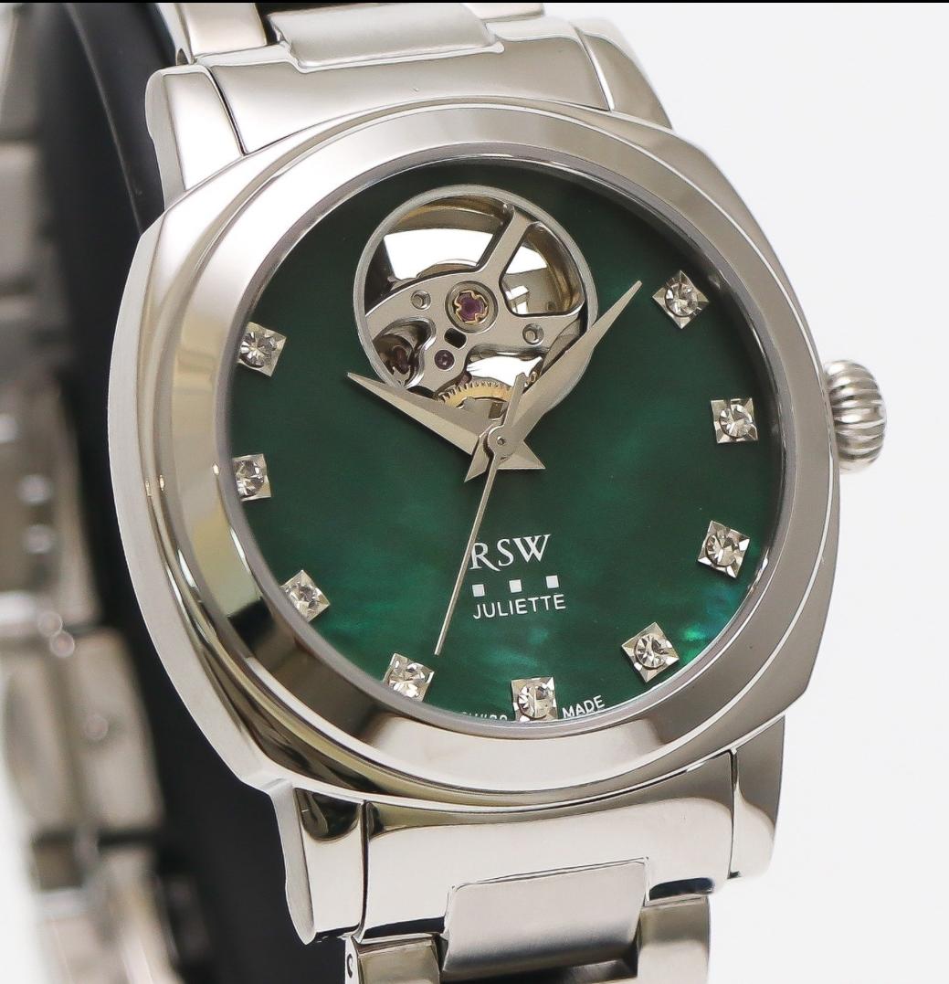 Ceas RSW Juliette Open Heart, nou, cu diamante, de mână, de damă. Mecanism automatic, calibrul RW24. Cadran din sidef de culoare verde, indici diamante, registru deschis în dreptul orei 12 prin care se vede mișcarea mecanismului. Brățară originală, din oțel, cu sistem de închidere de tip deployant. Accesorii: cutia originală, certificat de garanție și certificat de autenticitate pentru diamante.