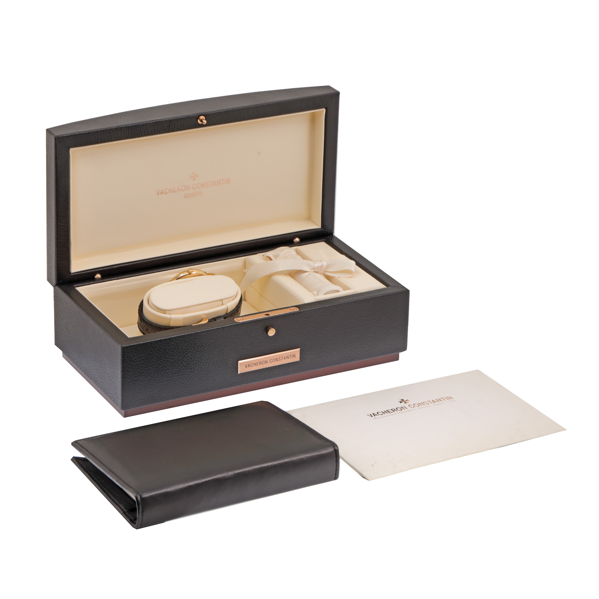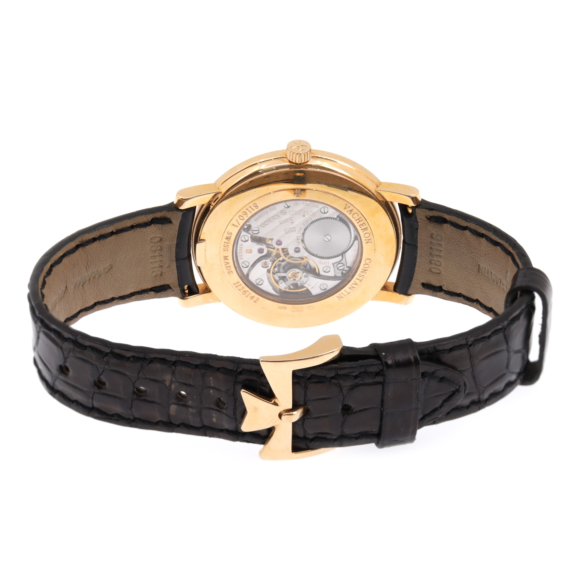 Ceas Vacheron Constantin Patrimony, din aur, de mână, bărbătesc, referință 81160/000R-9102. Mecanism cu armare manuală, calibrul JLC928. Cadran de culoare alb, indici cu numerale romane, cu un registru pentru secundar în dreptul orei 6. Curea originală, din piele, de culoare neagră, cu sistem de închidere de tip clasic. Accesorii: în cutia originală, cu certificat de autenticitate, certificat de origine, certificat de garanție, manual de utilizare.