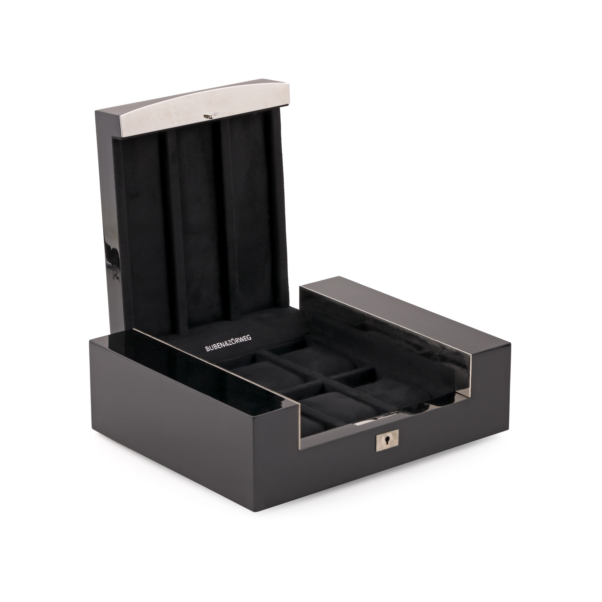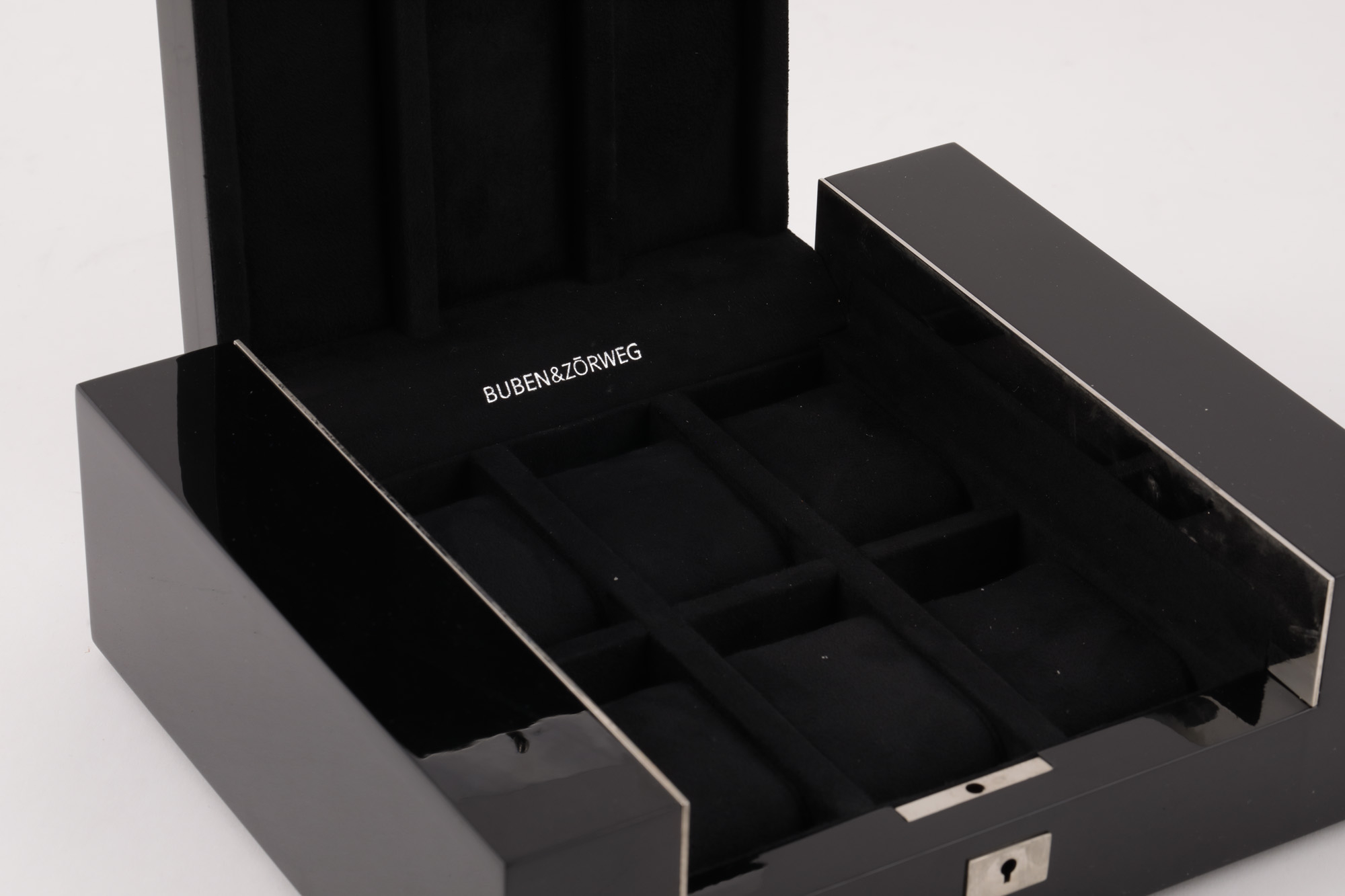 Cutie Buben & Zorweg Superior Piano pentru depozitarea ceasurilor. Cutia este prevăzută cu șase spații individuale fixe îmbrăcate în catifea și protejate de un capac cu cheie. Accesorii: ambalajul original.