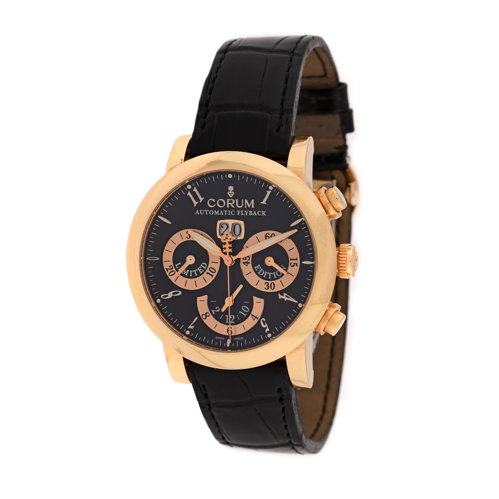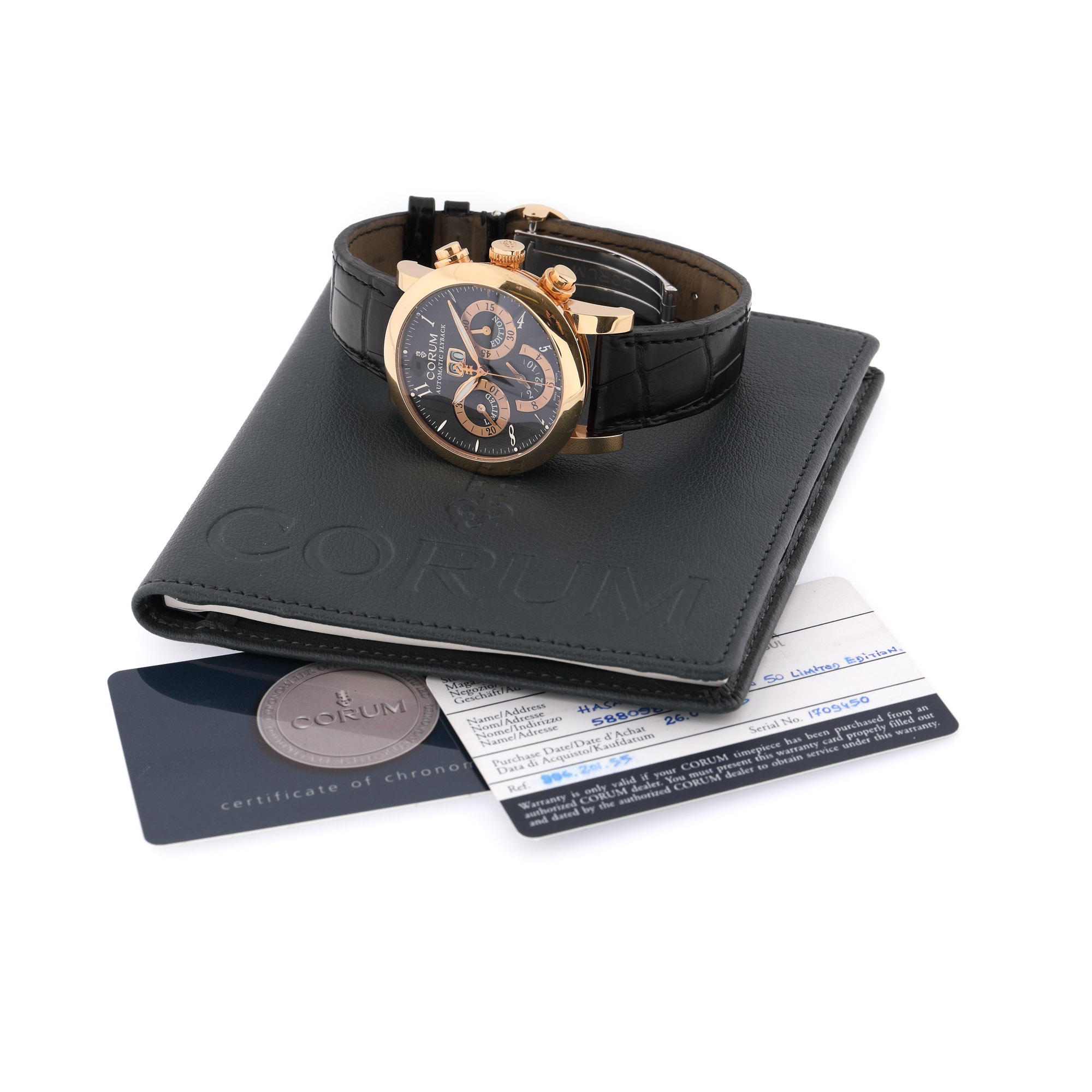 Ceas Corum Classical Chrono Flyback Grande Date, din aur roz, de mână, bărbătesc, ediție limitată 35/50, referință 996.201.55, mecanism automatic. Cadran de culoare negru, decorat în tehnica guilloché, numerale arabe, trei registre și registru pentru dată în dreptul orei 12. Curea din piele de culoare neagră și sistem de închidere tip deployant din aur alb și roz, originale. Accesorii: certificate de garanție internațională; manual de utilizare; certificat pentru cronomentru.