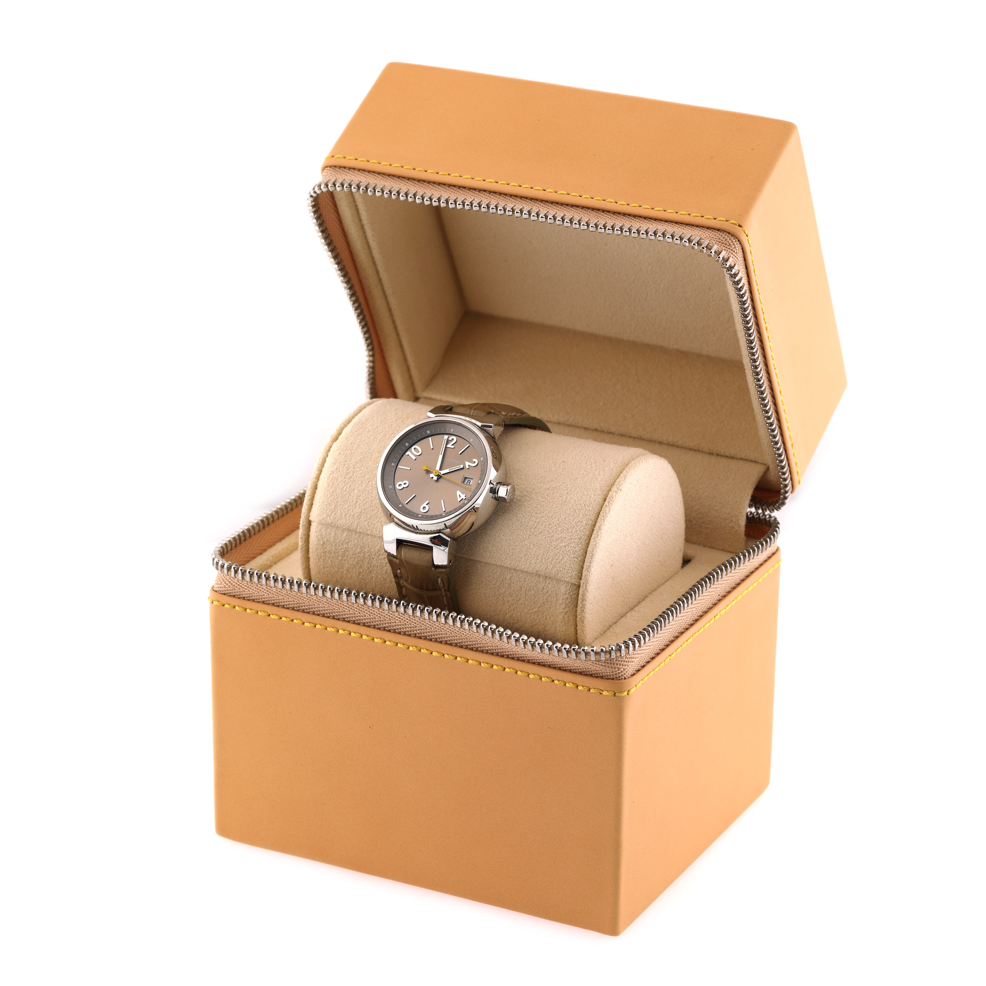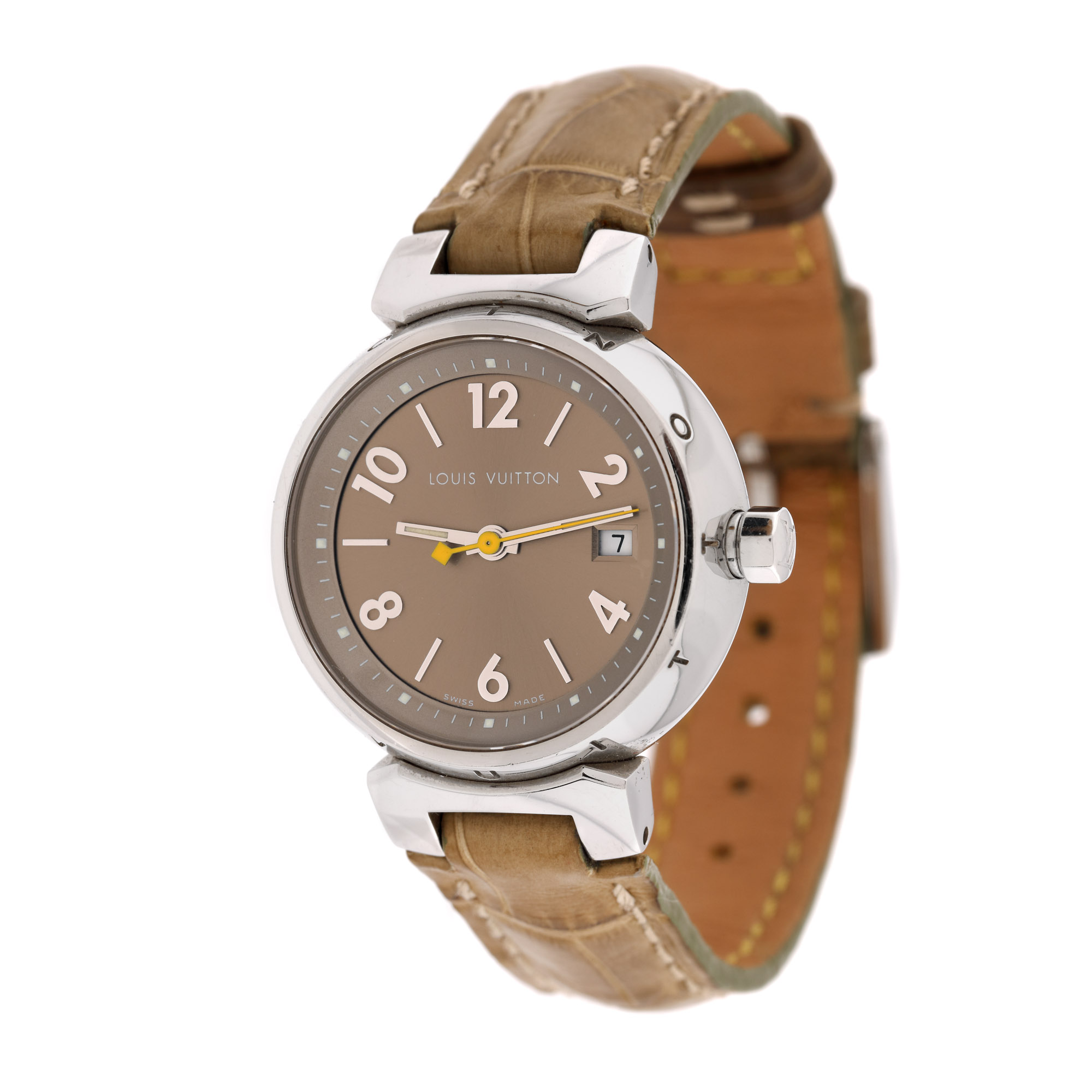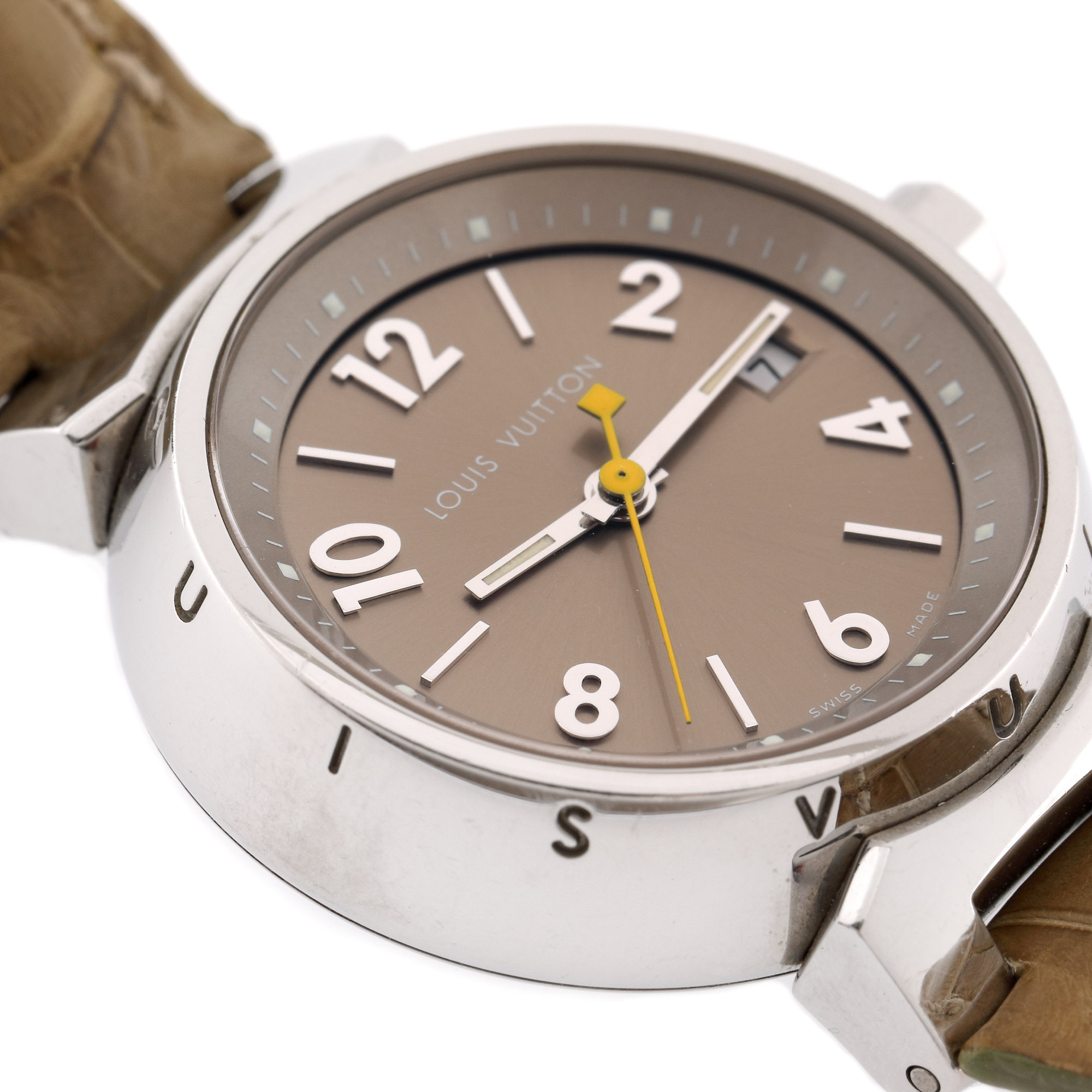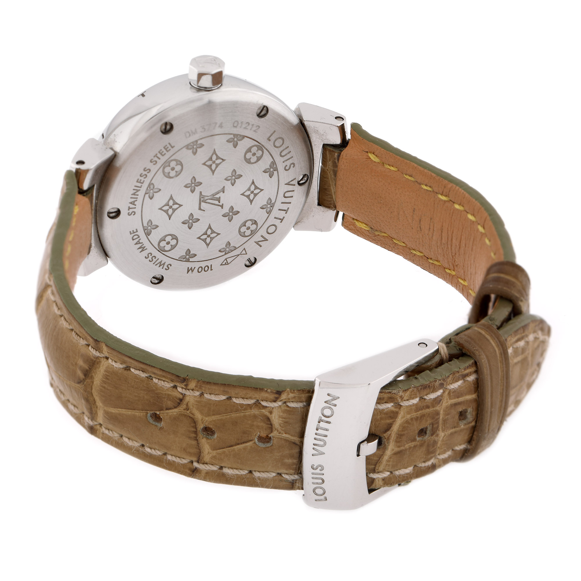 Ceas Louis Vuitton Tambour, de mână, de damă, referință Q1212, mecanism quartz. Cadran de culoare maro, cu numerale arabe și registru pentru dată în dreptul orei 3. Curea din piele de aligator, de culoare maro și cataramă, originale. Accesorii: cutie originală, manual de utilizare.