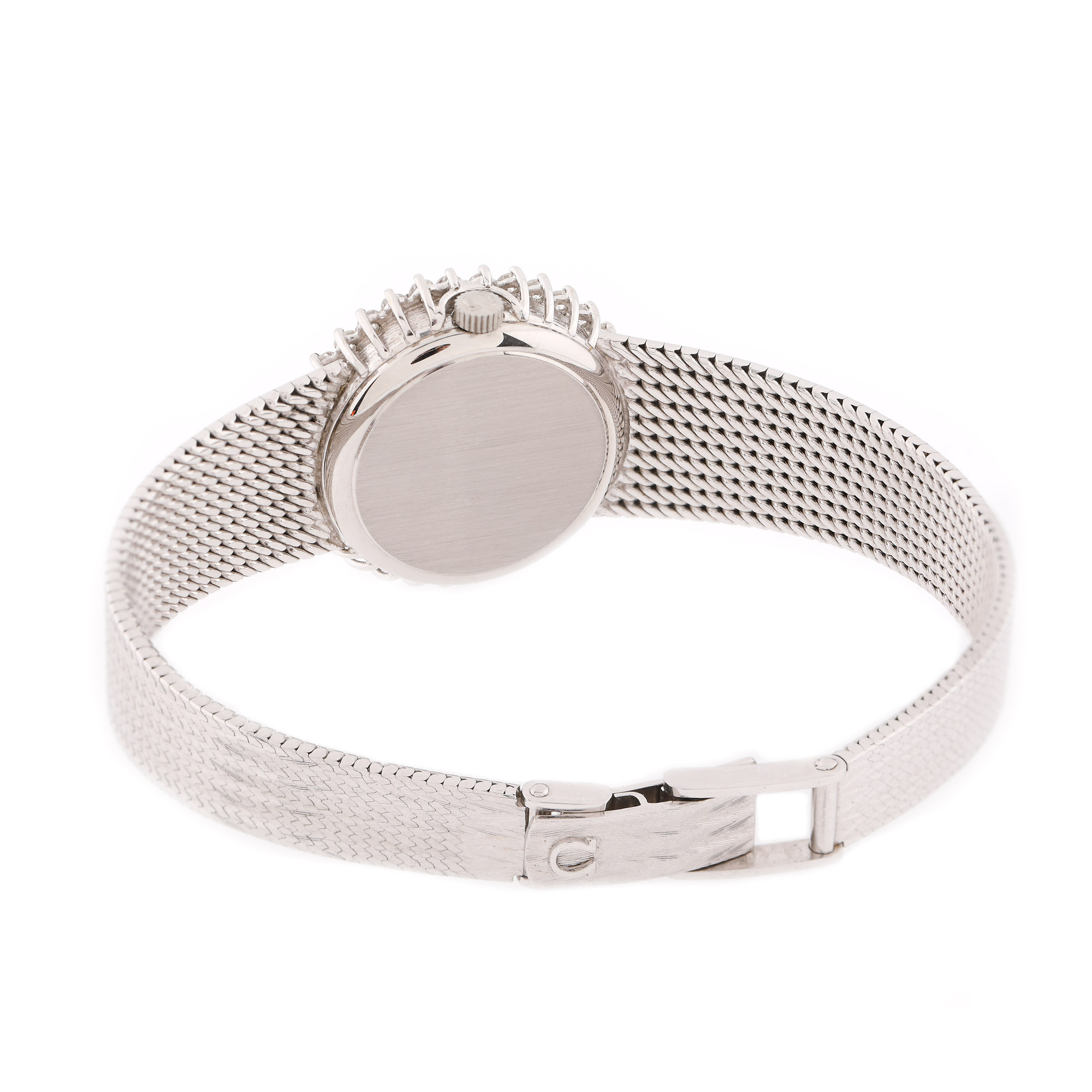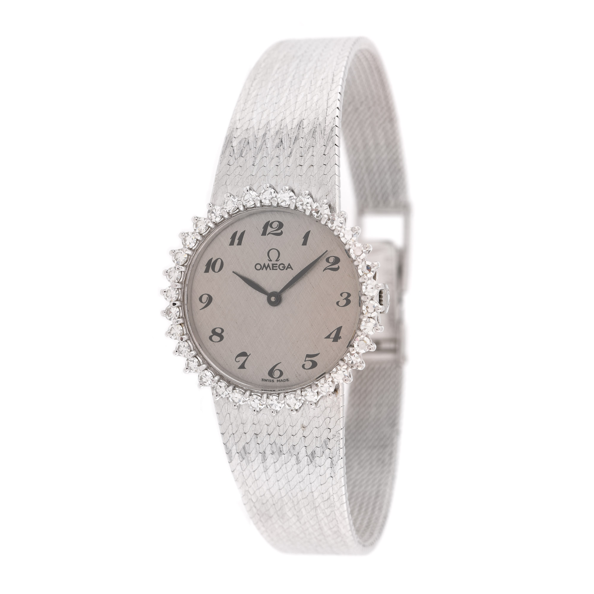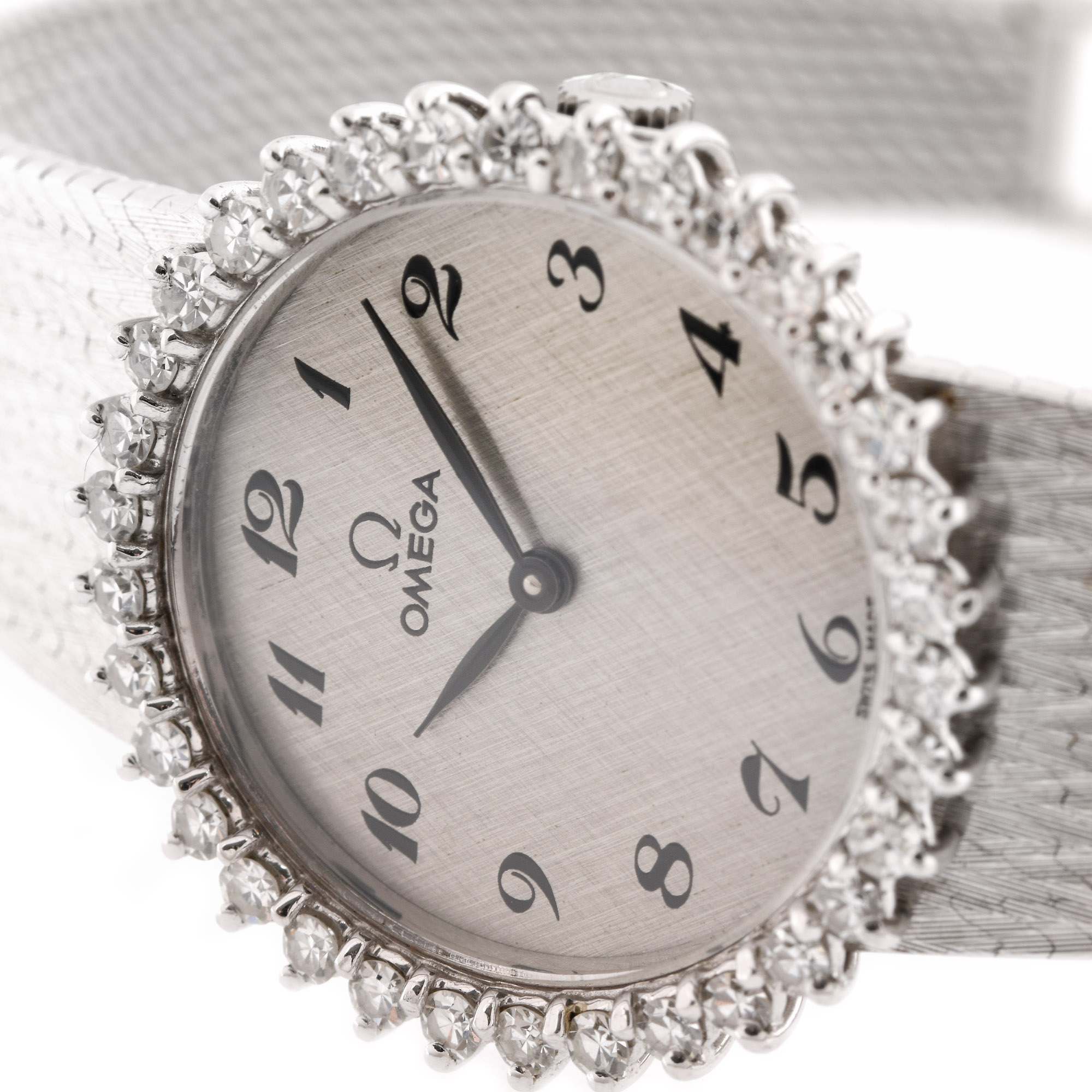 Ceas Omega din aur alb, de mână, de damă, cu mecanism cu armare manuală și cadran argintiu cu cifre arabe. Bezel decorat cu diamante. Una dintre ghearele de prindere ale unui diamant de pe bezel prezintă defect.