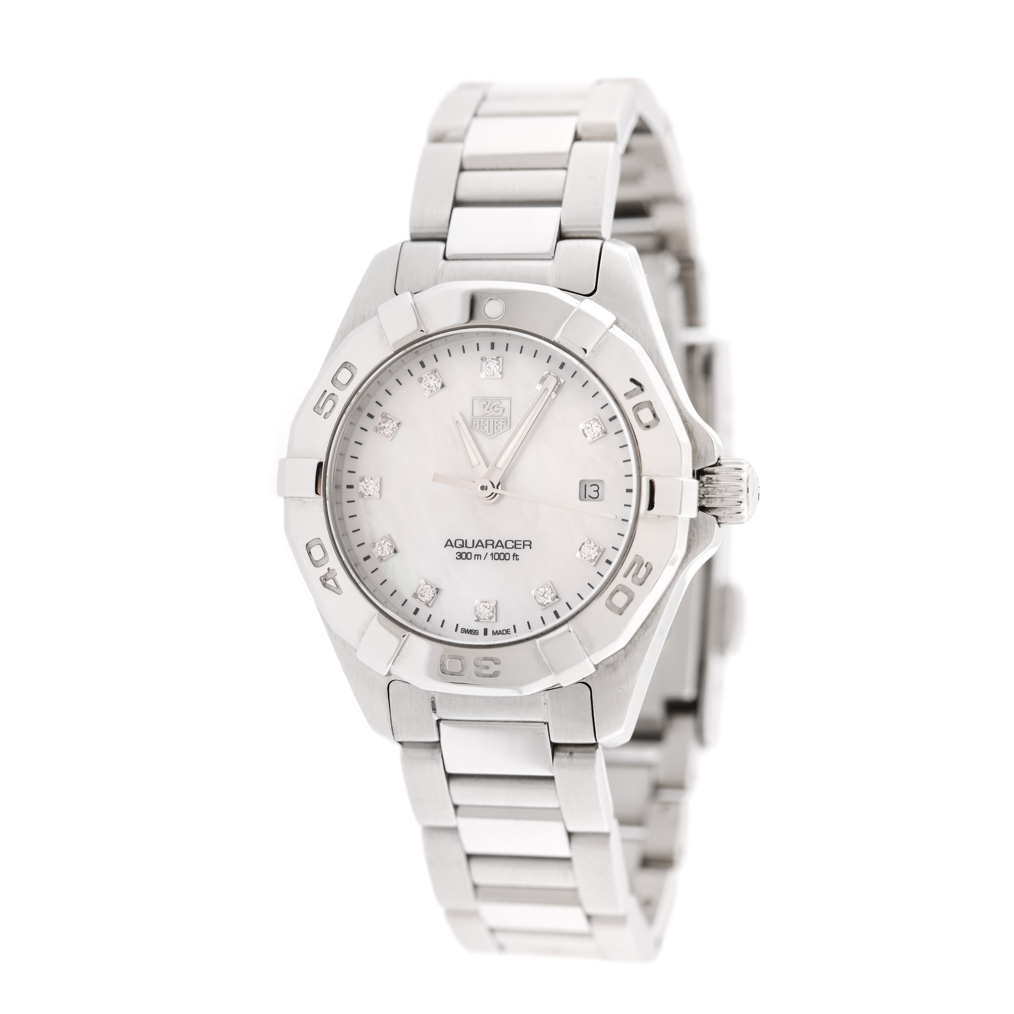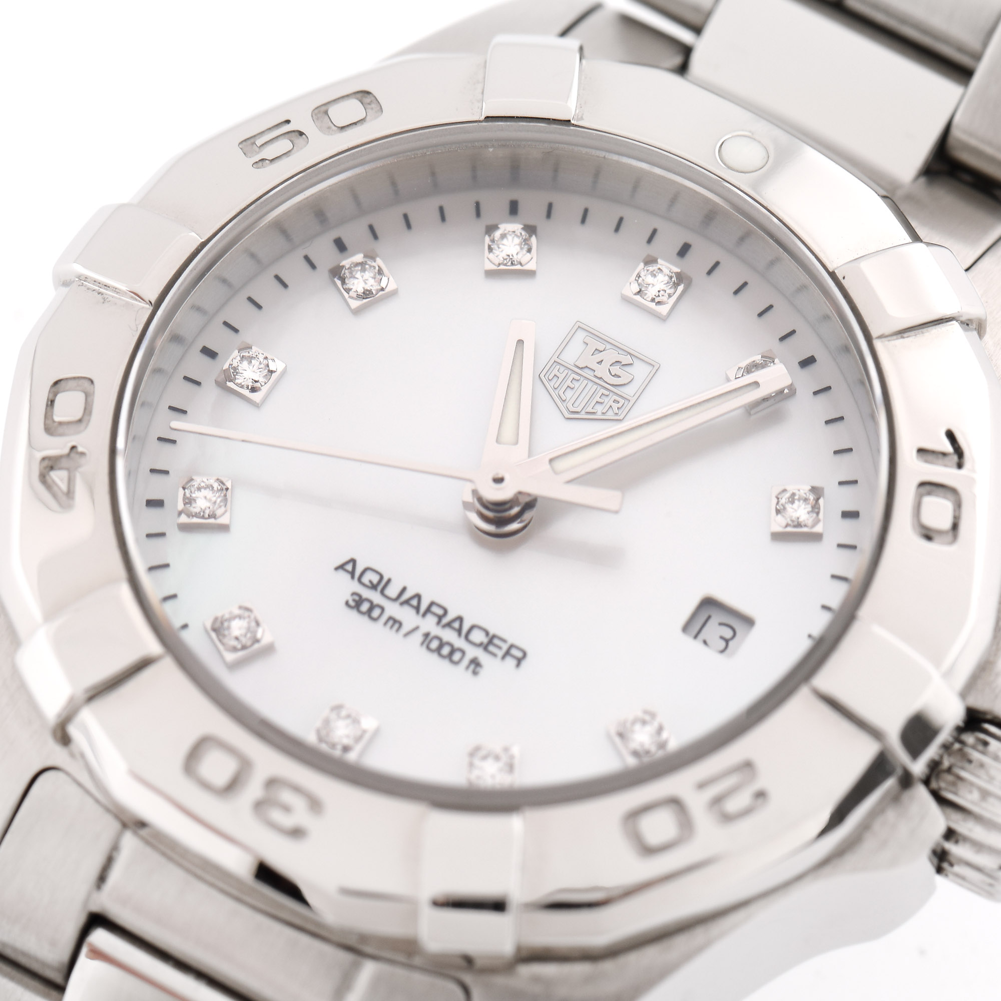 Ceas Tag Heuer Aquaracer, de mână, de damă, referință WAY1413.BA0920, mecanism quartz. Cadran din sidef, cu indici orari înlocuiți cu diamante, Bezel rotativ unidirecțional și registru pentru dată în locul orei 3. Brățară din oțel inoxidabil și sistem de închidere deployant, originale.