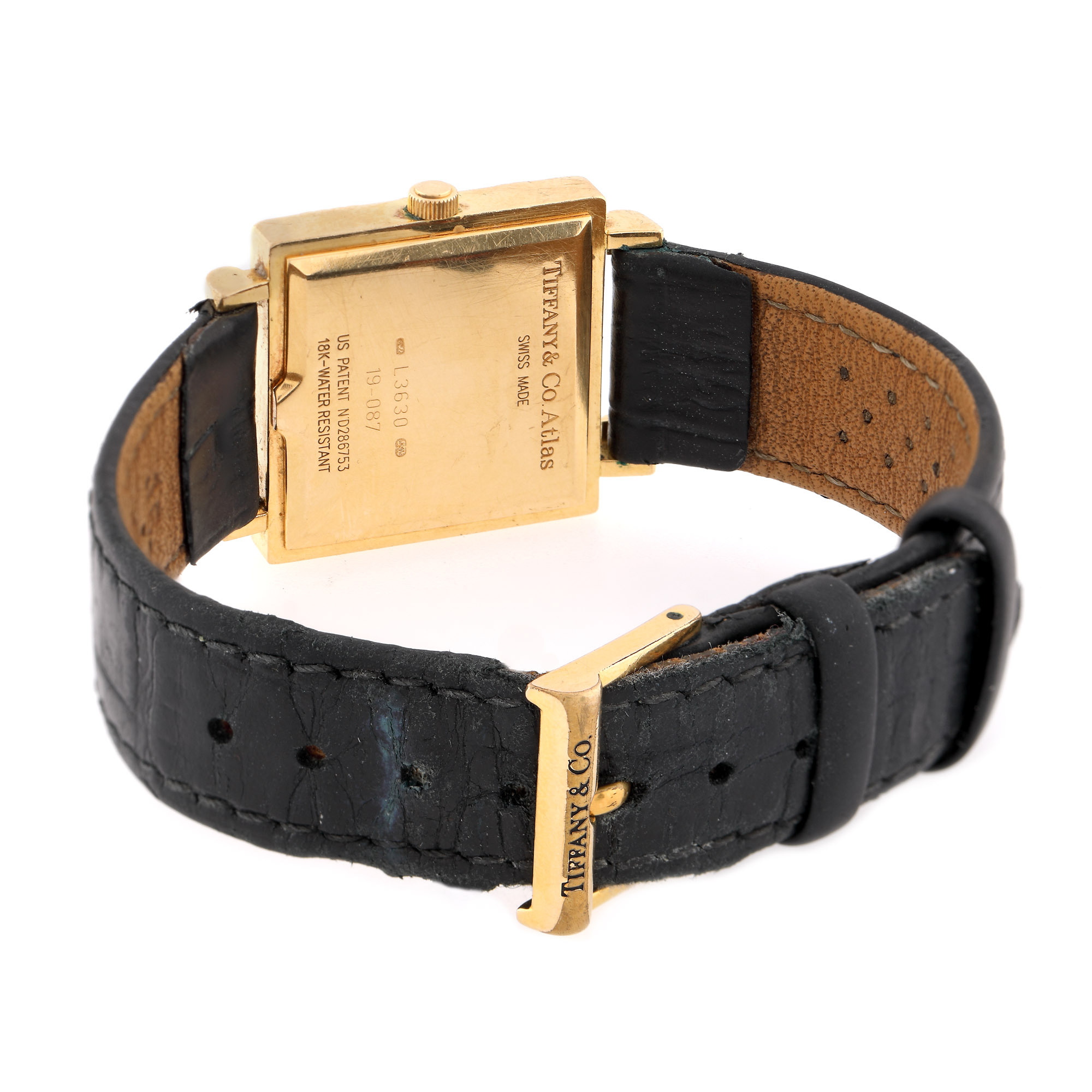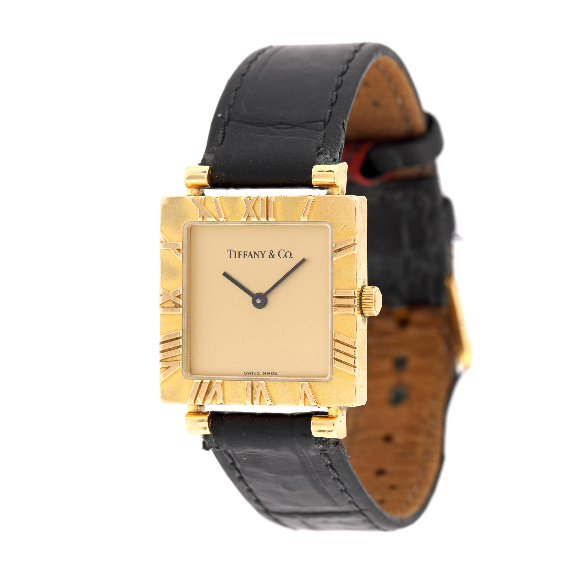 Ceas Tiffany&Co Gold Atlas, de mână, de damă, referință L3630, mecanism quartz. Cadran de culoare crem, cu cifre romane pe bezel. Curea din piele de aligator, de culoare neagră, înlocuită aftermarket și cataramă, originală.