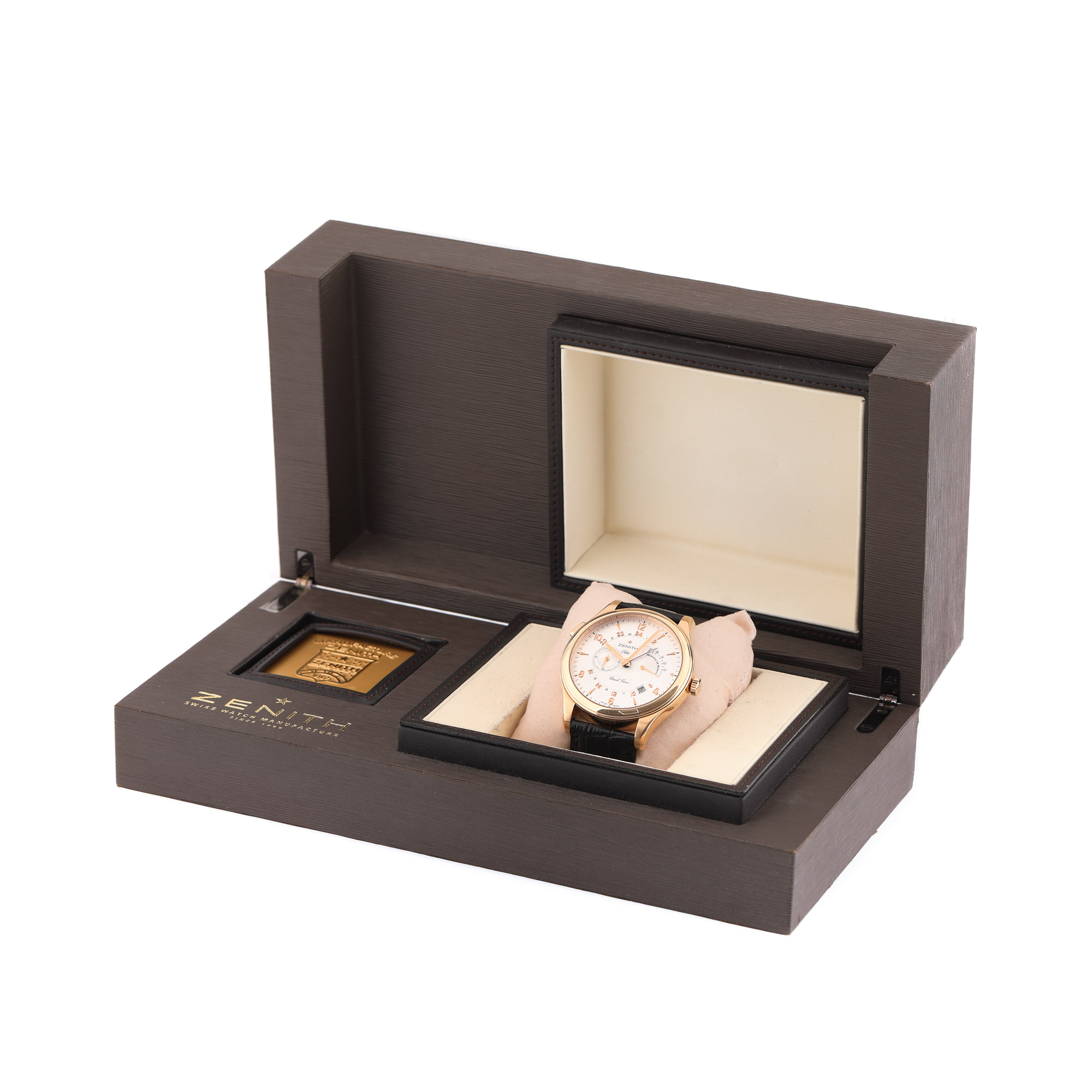 74. Ceas Zenith Grande Elite Dual Time, din aur roz, de mână, bărbătesc, însoțit de cutie originală [Cca. 2010]