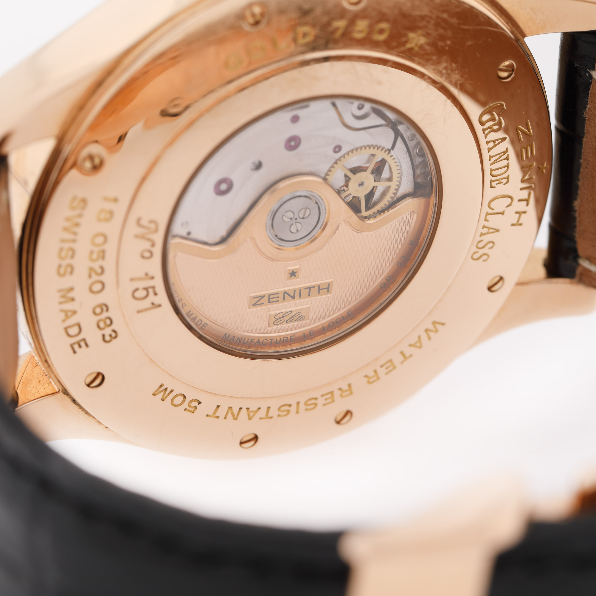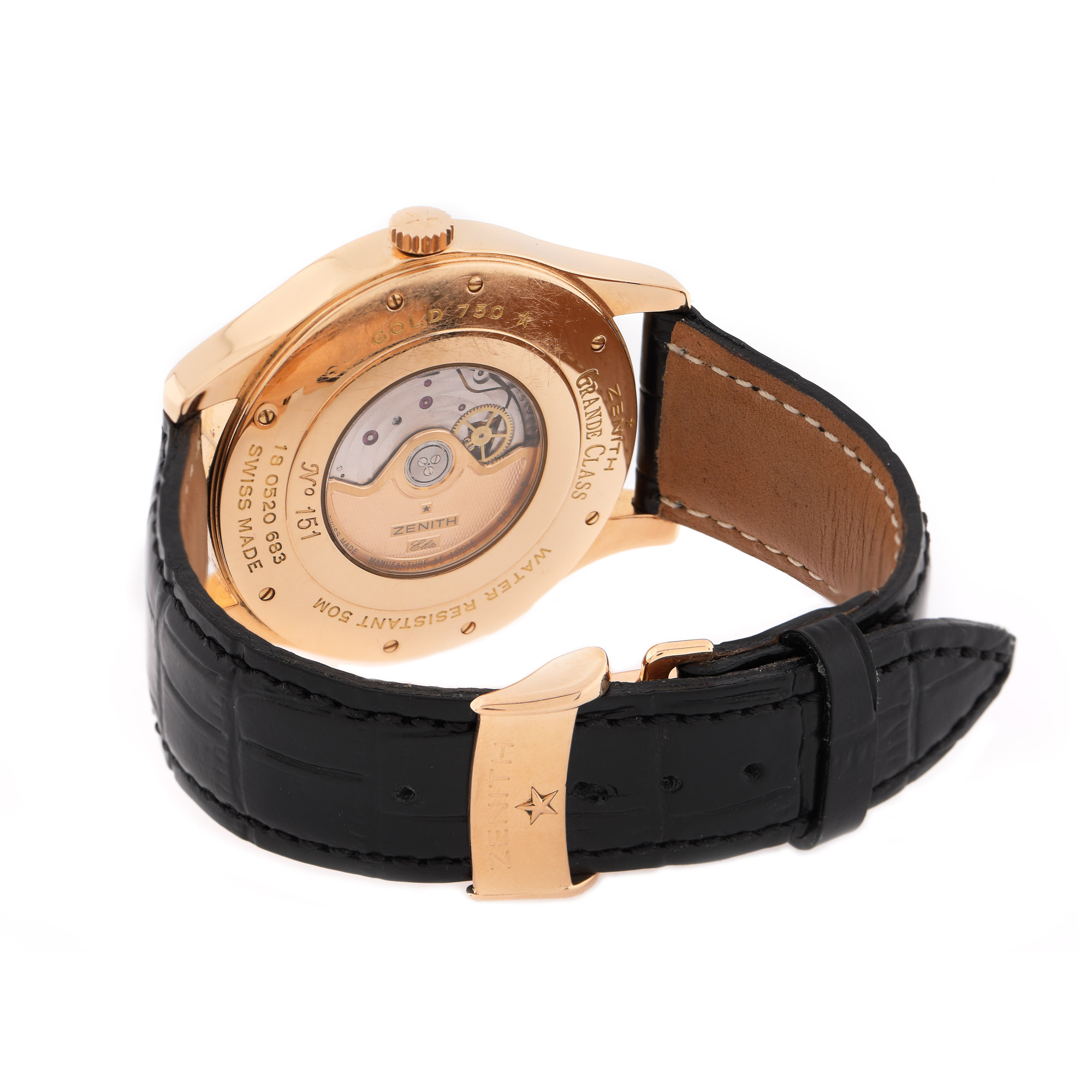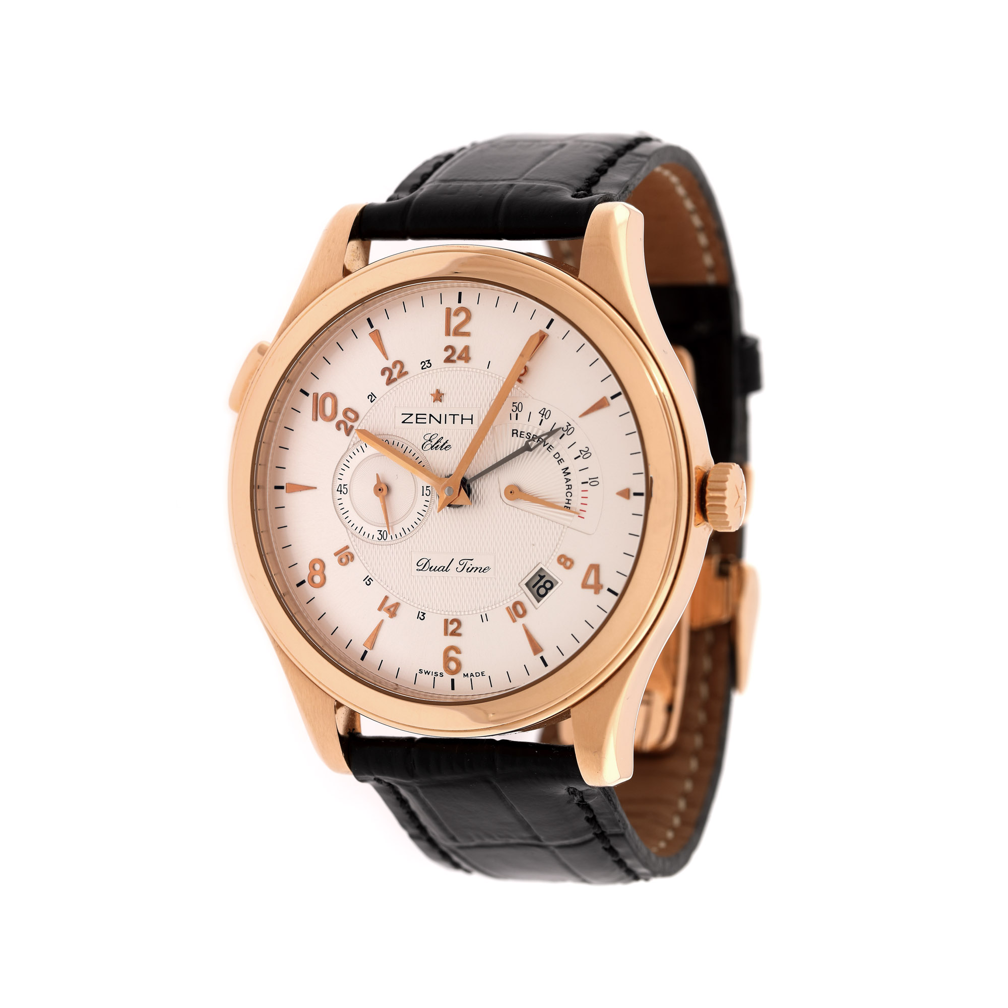 Ceas Zenith Grande Elite Dual Time, din aur roz, de mână, bărbătesc, referință 18.0520.683, calibru 683, mecanism automatic, anterior vitrat. Cadran silver, numerale arabe, două registre pentru secundar, rezervă de timp și registru pentru dată între orele 4-5. Curea din piele de aligator, de culoare neagră, adăugată aftermarket și sistem de închidere tip deployant, din aur roz, original. Accesorii: cutie originală.