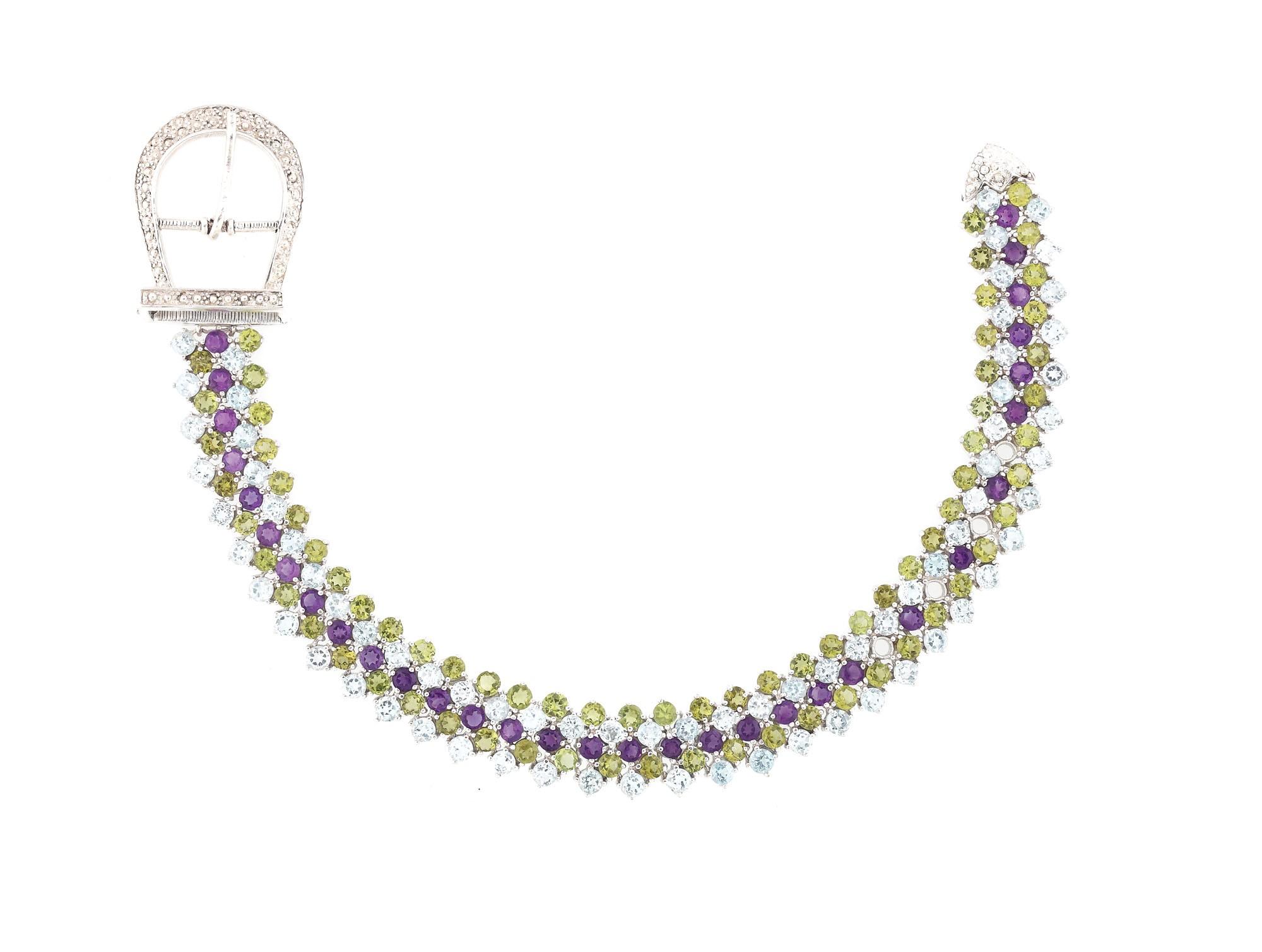 45. Brățară-curea din argint, decorată în manieră Art Deco, ornată cu peridote, ametiste și topaze
