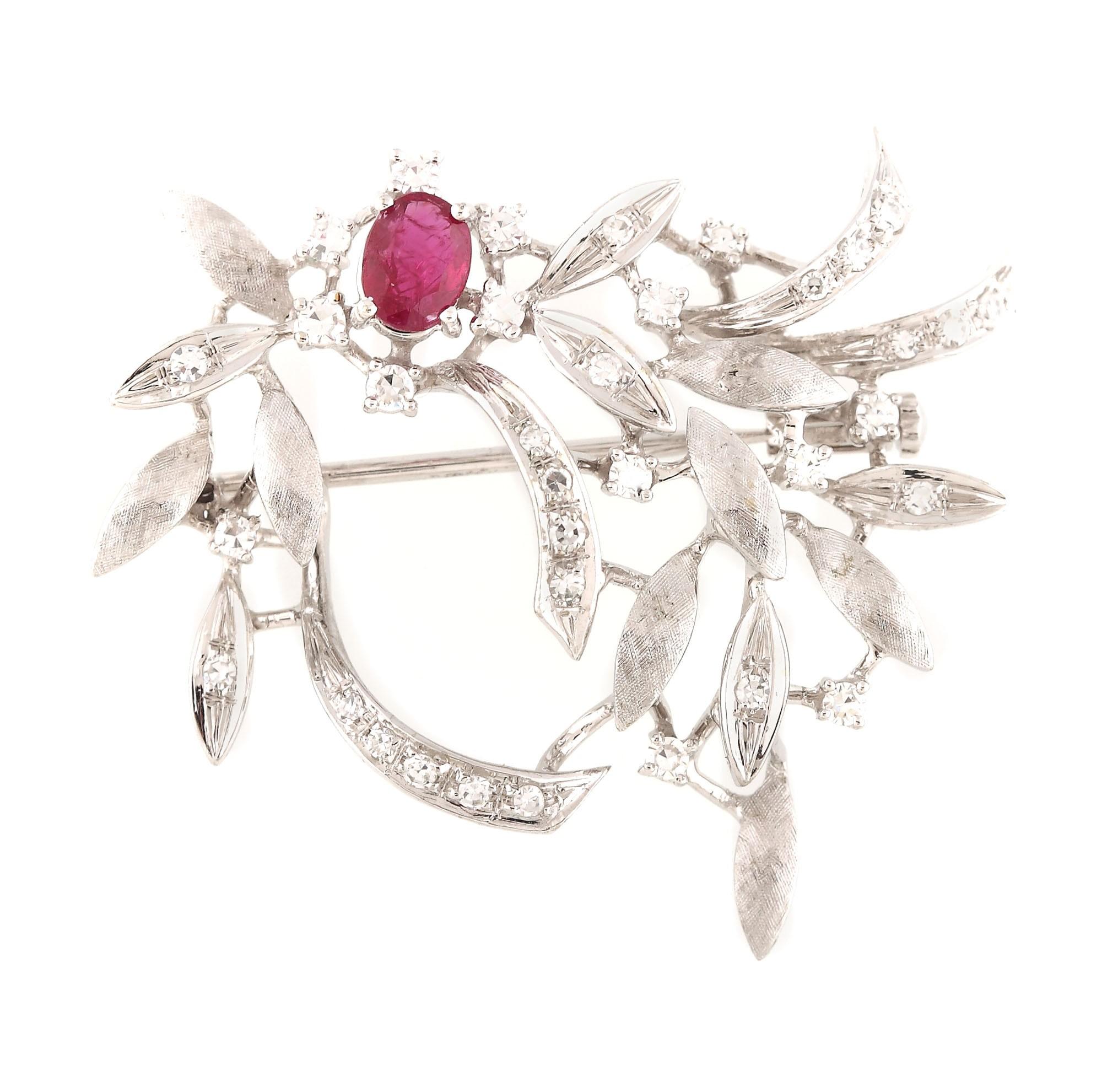 69. Broșă din aur alb, decorată cu ramuri presărate cu diamante și un rubin