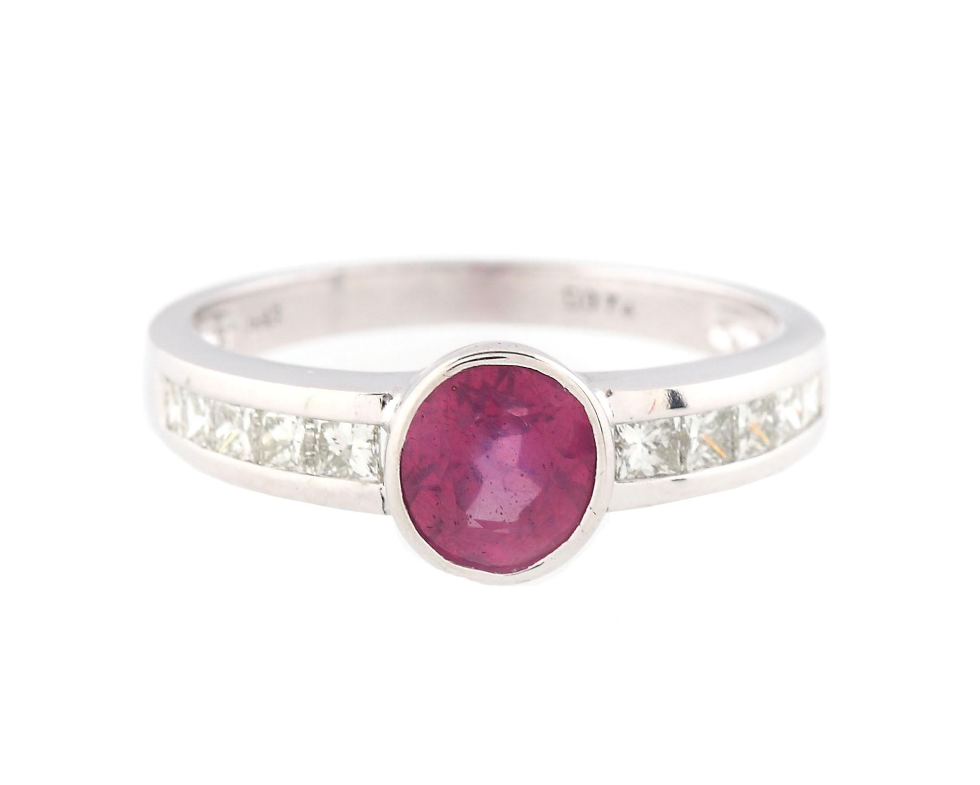 1 rubin oval fațetat cca. 1,88 ct., culoare roșu, claritate SI și 10 diamante princess cut cca. 0,74 ct., culoare M-N, claritate VS