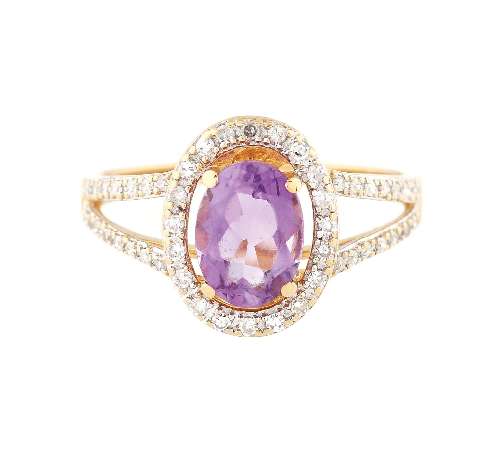 48. Inel din aur, ornat cu ametist în anturaj de diamante
