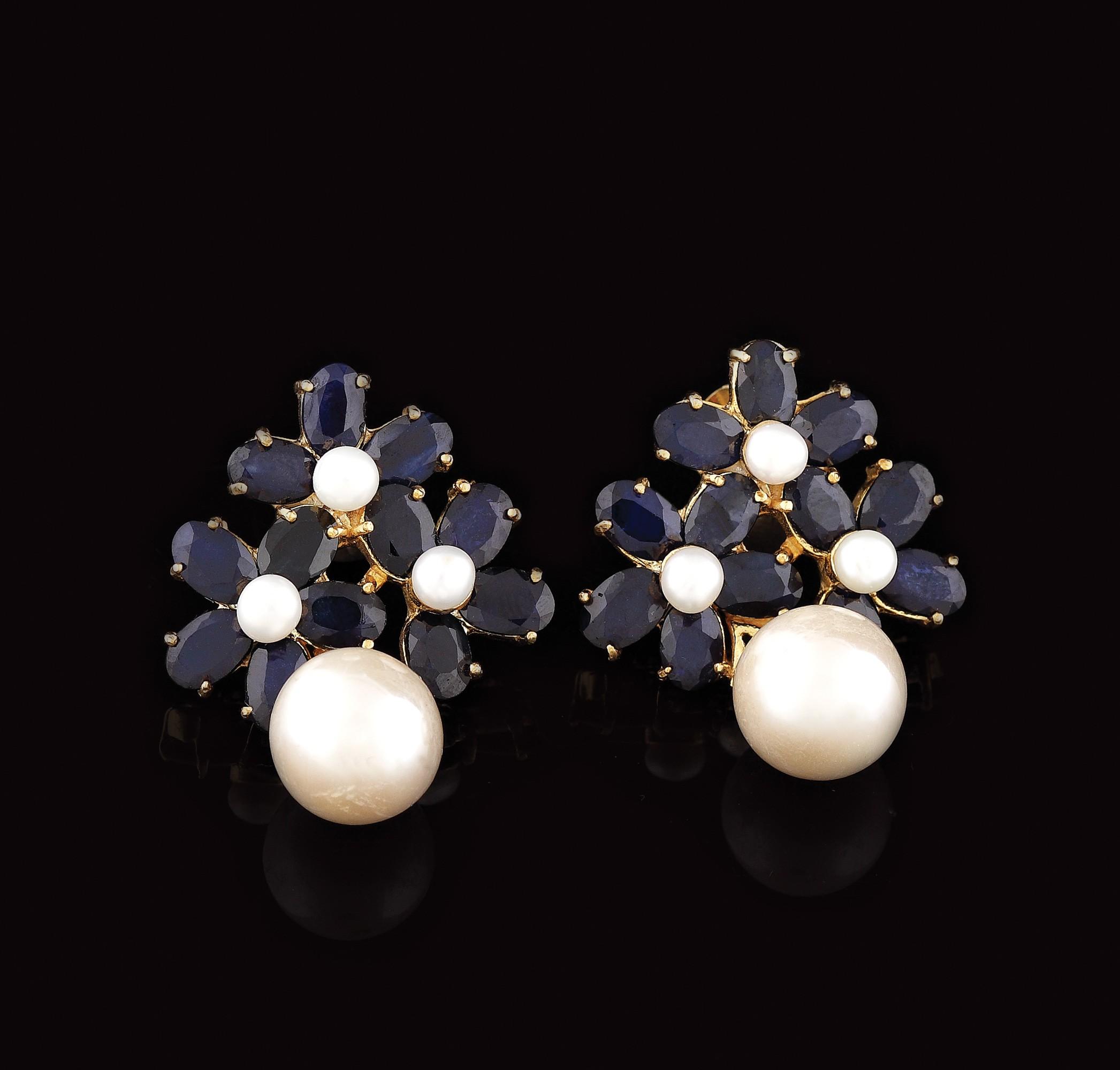 61. Pereche de cercei din argint aurit, decorată cu flori de safire și perle