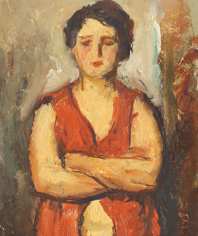 ompoziția tonitziană reprezintă una dintre cele mai stabile construcții plastice pe care le-a cunoscut pictura românească interbelică. Continuator al maeștrilor Grigorescu și Luchian, atras în special de fregilitatea cromaticii celui de-al doilea, Tonitza va elabora un discurs pictural distribuit cu atenție la granița dintre post-impresionism, drept componenta plastică, și expresionism, în ceea ce privește tratarea psihologică a motivului scrutat. Fire fragilă emoțional, cu pete de tragism ce-i “colorează” viața, Tonitza și-a îndreptat atenția cu precădere asupra universului uman, indiscutabil creat, modelat și trecut prin filtrul psihologic personal. Astfel regăsim în portretistică adeziunea artistului la evidența vieții, și, chiar dacă planul formal nu devine traducător al universului proxim, uleiurile bârlădeanului ating esența chipului uman în cea mai profunda însemnătate. Portretele lui Tonitza, în special cele create între 1920 și 1938, se derulează pe parcursul acestor două decenii într-o manieră cursivă, dinspre universul intim(soția, copiii) către o creație universal-românească. Chipurile copiilor sunt cele ce deschid drumul unei portretistici afective, în care Tonitza își declară crezul artistic. Pentru artist portretul nu trebuie să răspunde unor cerințe de veridicitate absolută, zugrăvirea trăsăturilor fiind abordată de foarte multe ori într-o manieră sumară, chiar vagă uneori. Intensitatea culorii devine astfel principala caracteristică definitorie în prezentarea chipului, chiar și în desenarea trupului. Jocul de nuanțe căutat de Tonitza, nuanțe de interpretare dar și de nuanțe cromatice, a dus la conceperea efectivă a complexității umane, care nu trebuie să fie cuantifică într-o reproducere rece, insensibilă, după “natură”. Aprofundarea portretului a dus astfel la o interpretare psihologică, cauzată și de caracterul pictorului, răscolit de propria-i existență tumultoasă. Tenta dramatizantă nu apare imediat, ci se dezvoltă treptat, însă aceasta se va manifesta destul de pregnant începând cu a doua jumătate a deceniului trei al secolului trecut. Odată cu modelarea chipurilor propriilor copii, Tonitza va începe să conceapă treptat un portret-tip, unde nu mai caută să reproducă un chip anume, ci să surprindă expresia, trăsătura, grimasa prin căutarea sentimentului profund uman, de cele mai multe ori chiar cel propriu. La începutul anilor ’30, până la descoperirea farmecului irizant al Balcicului, Tonitza creează o adevărată serie de compoziții cu personaje(feminine) în care alternează farmecul adolescenței cu o anumită apăsare sufletească. Tinerele modele, pictate fie în portret, fie în nud, depășesc acea recognoscibilitate amintită mai sus, tocmai în căutarea unei interpretări expresioniste. Forma și culoarea sunt încărcate de intensitate psihologică ce vibrează în uleiuri ca “Copil cusând”(Muzeul de Artă Constanța, inv. 342), “Fetiță cu ciorapi negri”(Muzeul de Artă Constanța, inv. 4054) sau “Fetiță cu spatele”(Muzeul de Artă Constanța, inv. 4096). Astfel o regăsim și pe “Catrina” într-un ulei în care accentul este imediat strămutat către lirismul compozițional. Tușele nu sunt multe, însă îndeajuns de accentuate cât să devină narative, iar chipul este doar schițat, în nuanțări scurte de pensulație, amintind fragilitatea adolescentină. Descoperim un portret de expresie, în care acțiunea germinează în fiecare tușă și pată de culoare, iar gestul rămâne doar posibil, dar nu necesar. (I.P.)