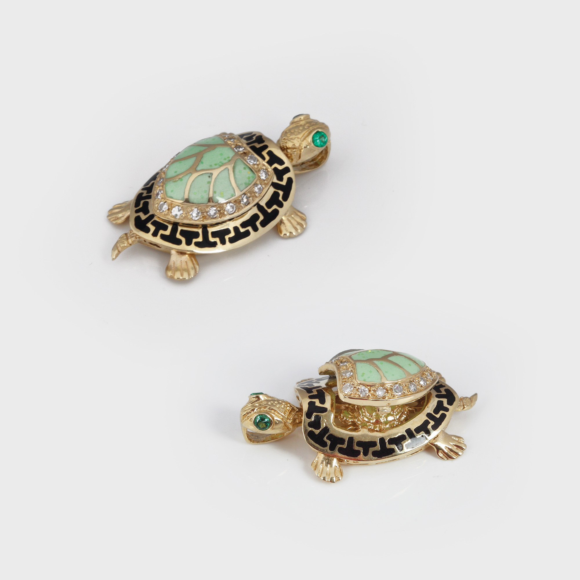 aur galben 14 k, email, 18 diamante cu tăietură briliant cca.0,18 ct total și 2 granate verzi cu tăietură briliant 0,08 ct total, diamante culoare I-J, claritate I1-SI2