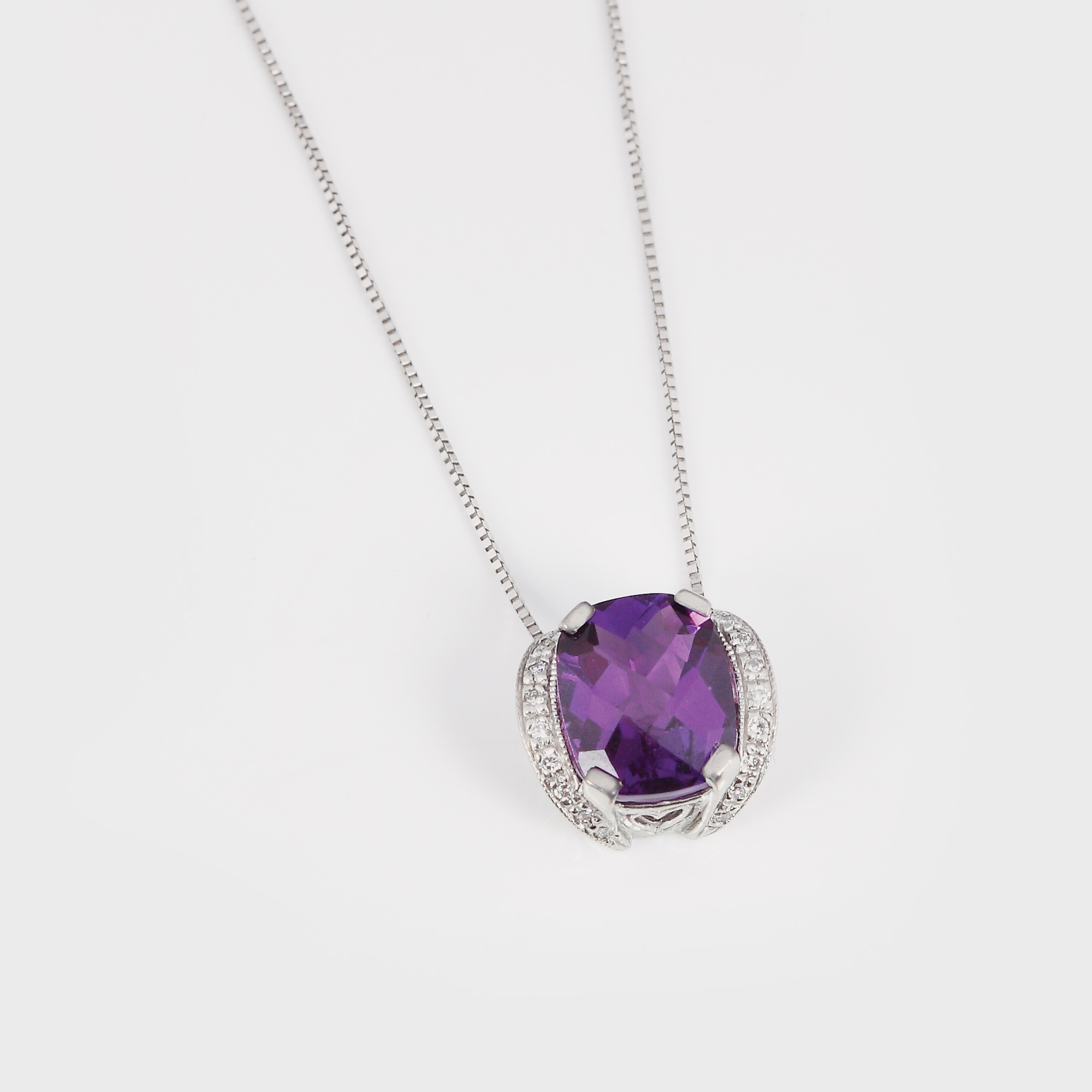 aur alb 14 k, un ametist cu tăietură fancy octogon cca. 2,72 ct total și 20 diamante cu tăietură briliant 0,06 ct total, diamante culoare I-J, claritate I1-SI2, ametiste VS