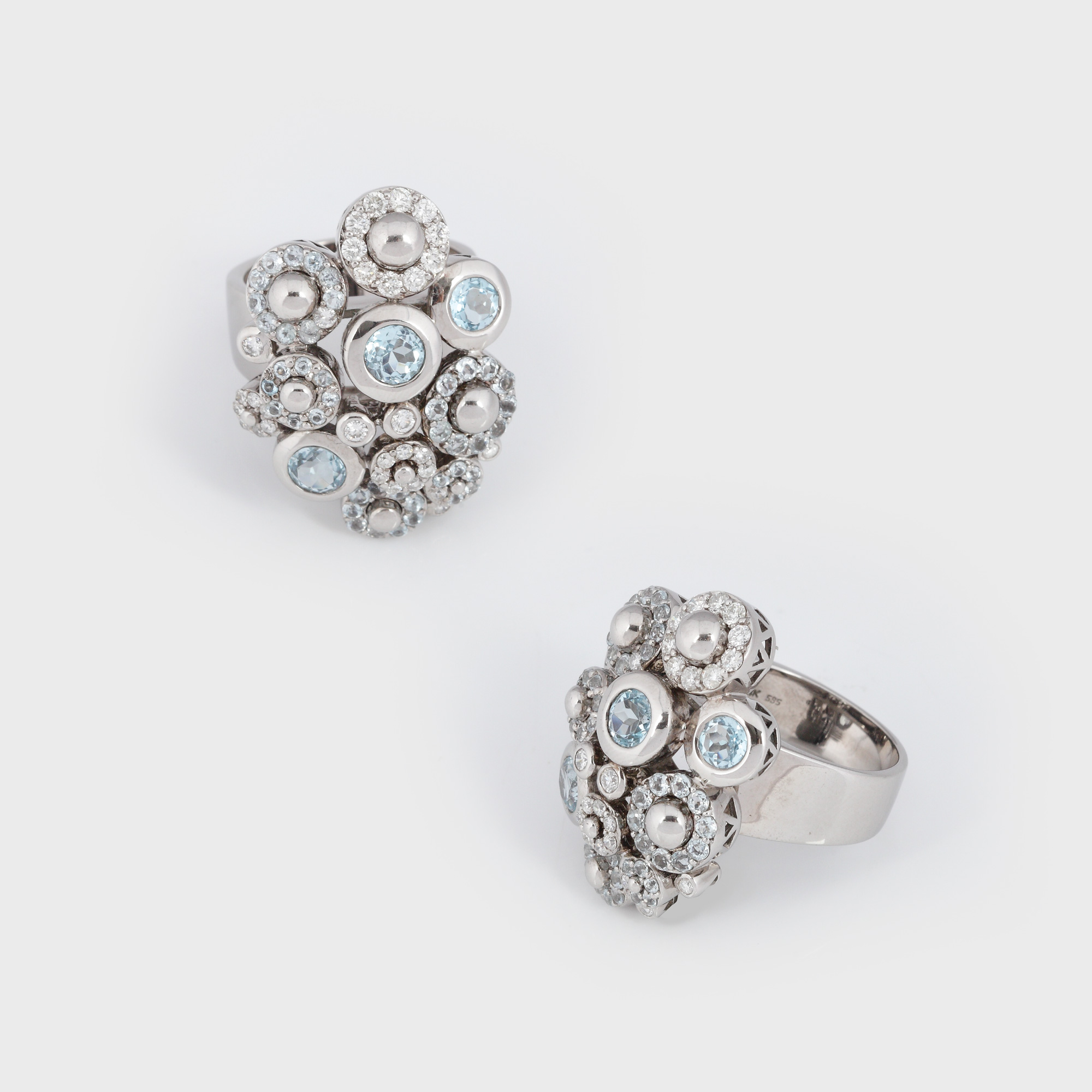 aur alb 14 k, 47 topaze cu tăietură briliant cca. 1,70 ct total și 29 diamante cu tăietură briliant cca. 0,45 ct total, topaze culoare albastru mediu deschis și alb; diamante culoare I-J, claritate I1-SI2