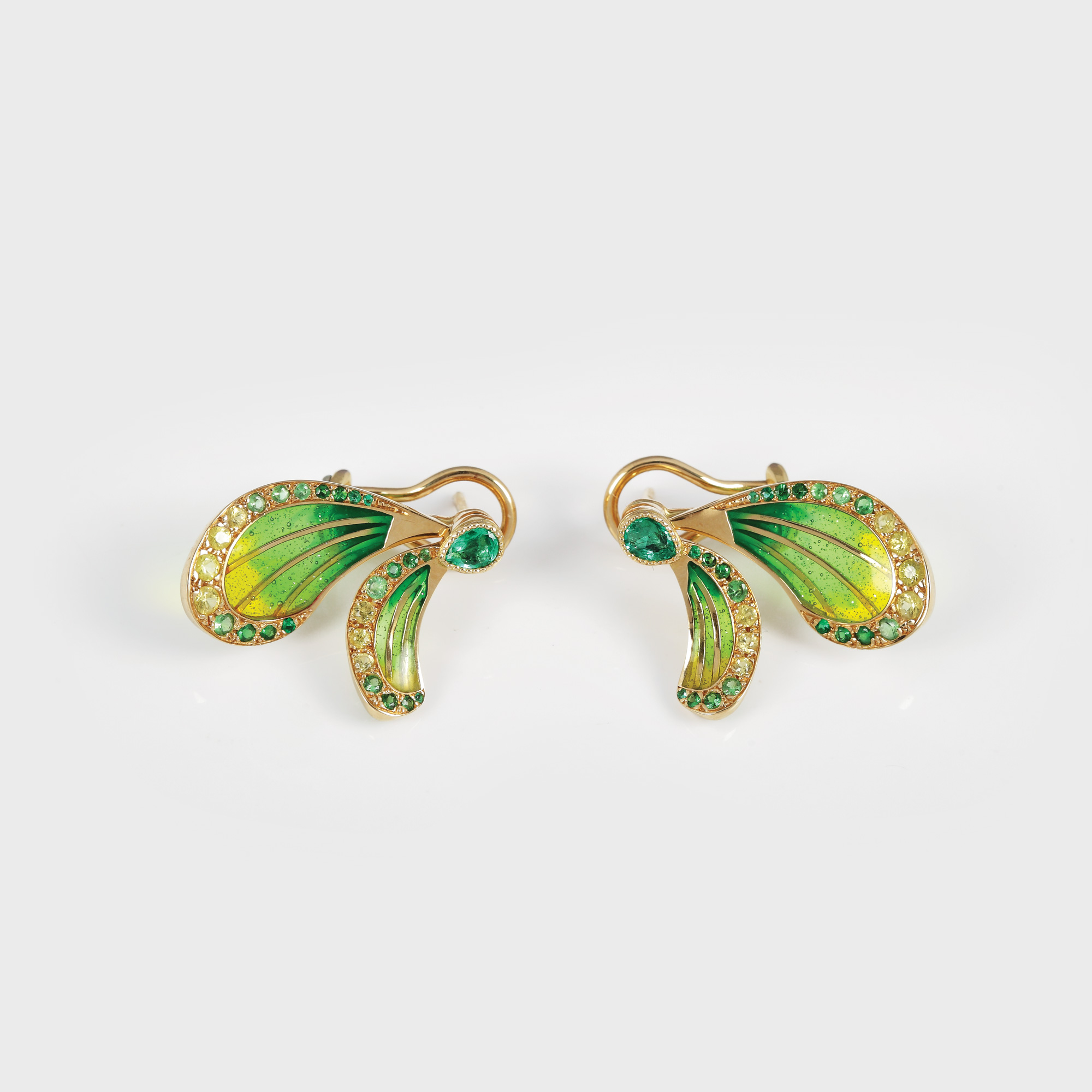 248. "Aripi" - Splendidă pereche de cercei Lalique, din aur decorați cu mix de safire, granate și smaralde