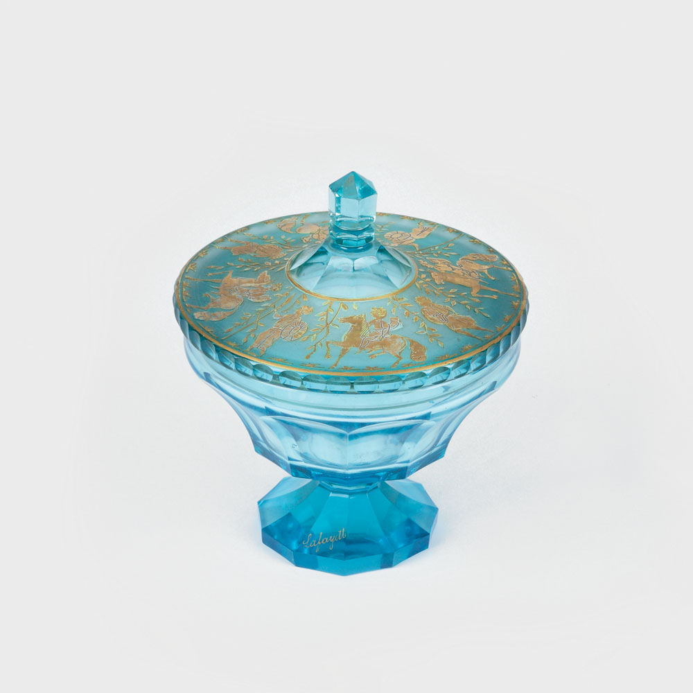 Bomboniera cu capac este realizată din cristal transparent colorat în masă albastru turcoaz, modelată prin tăieturi, gravată şi parţial aurită. Baza rotundă este faţetată, corpul tronconic are tăieturi mari, adânci, arcuite. Capacul, cu buton înalt, are buza decorată cu lanţ de ove tăiate, iar suprafaţa este gravată cu o friză de amazoane uşor reliefate şi aurite. Pe baza cupei, cu aur, este inscripţionat magazinul ce a lansat piesa pe piaţă “Lafayette”.