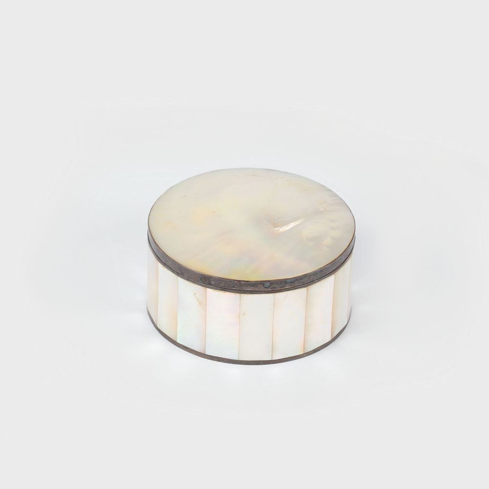 Caseta, rotundă în contur, este realizată din plăcuţe din sidef alăturate, montate la buză în șină din argint, la fel și capacul lejer bombat.