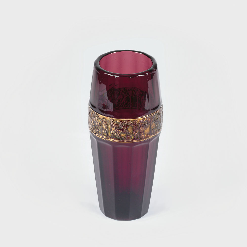 Vas cu bază circulară, de formă cilindrică faţetată, uşor evazată spre partea superioară. În zona intermediară este decorat cu un manşon pe care sunt reprezentate scene alegorice şi de gen, subliniate cu aur. Tipologie preluată de la Atelierul Moser Karlsbad.