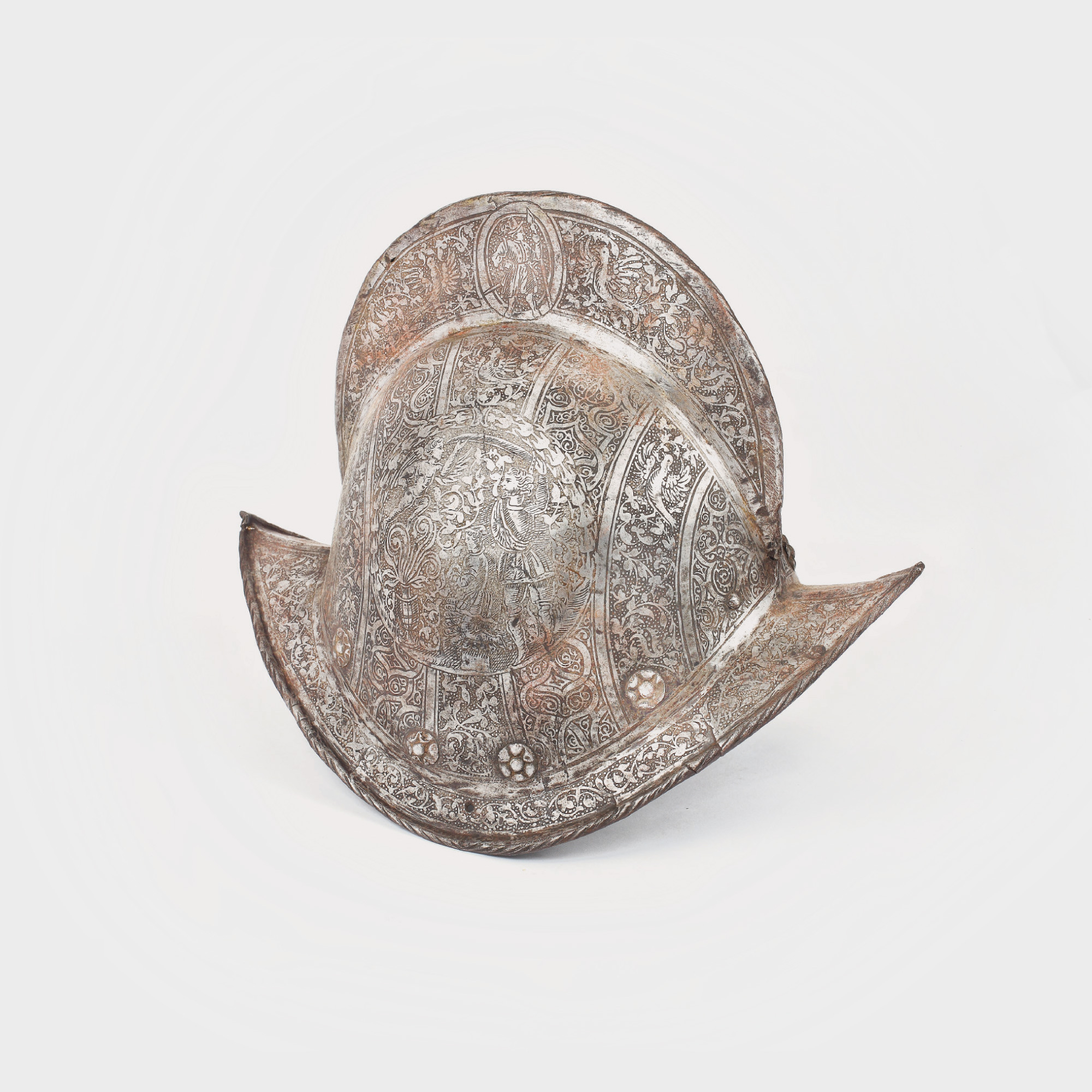 331. Coif german, fin gravat cu scene medievale, sfârșitul sec. XVI