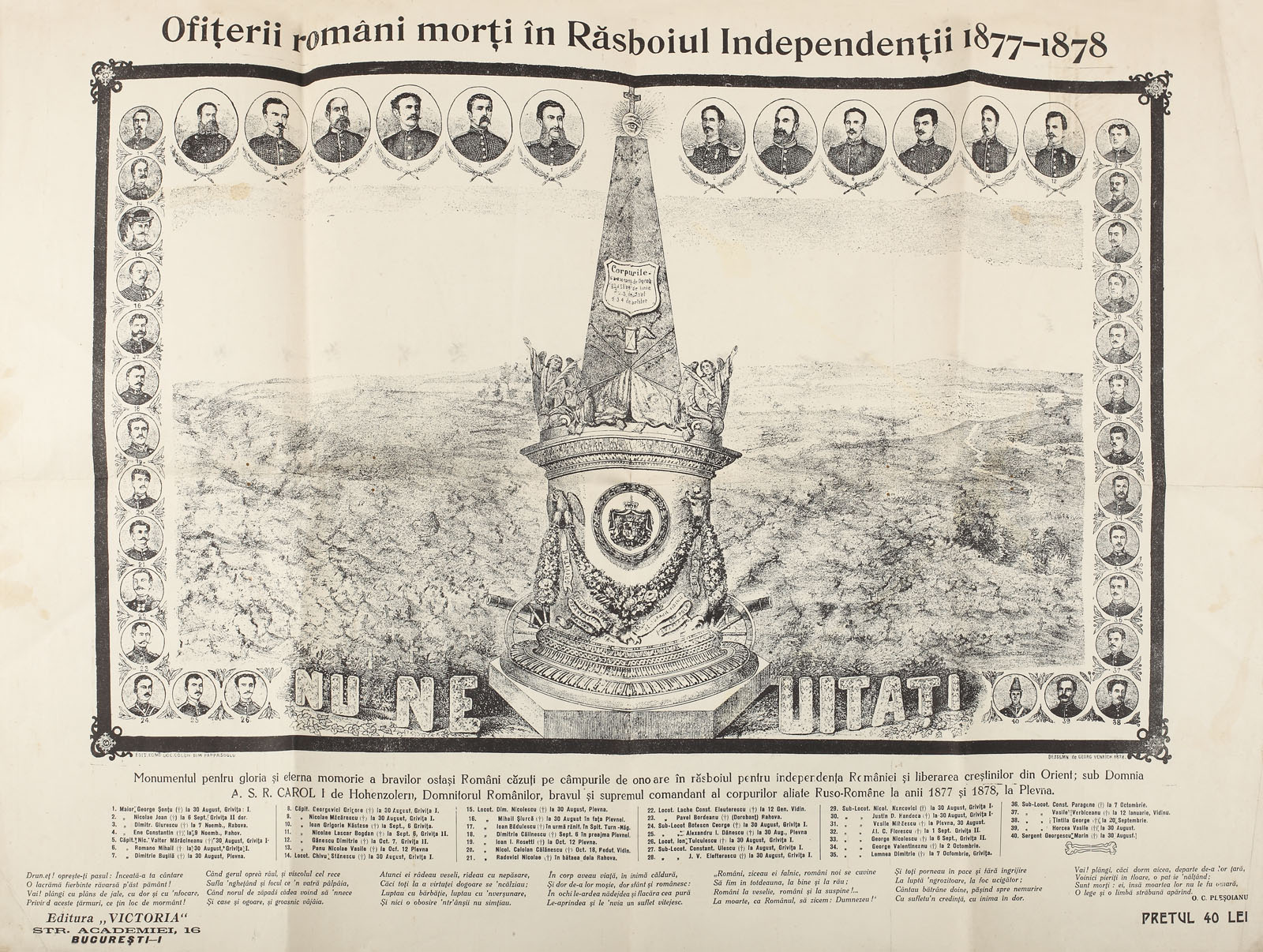 Afișul reproduce un desen mai vechi realizat de Georg Venrich în 1878 și tipărit din inițiativa istoricului și colecționarului Dimitrie Pappasoglu. Litografia cuprinde monumentul eroilor în centru și în chenar portretele militarilor căzuți pe câmpul de luptă. În registrul inferior se găsesc date și informații despre bătăliile în care aceștia s-au jertfit.