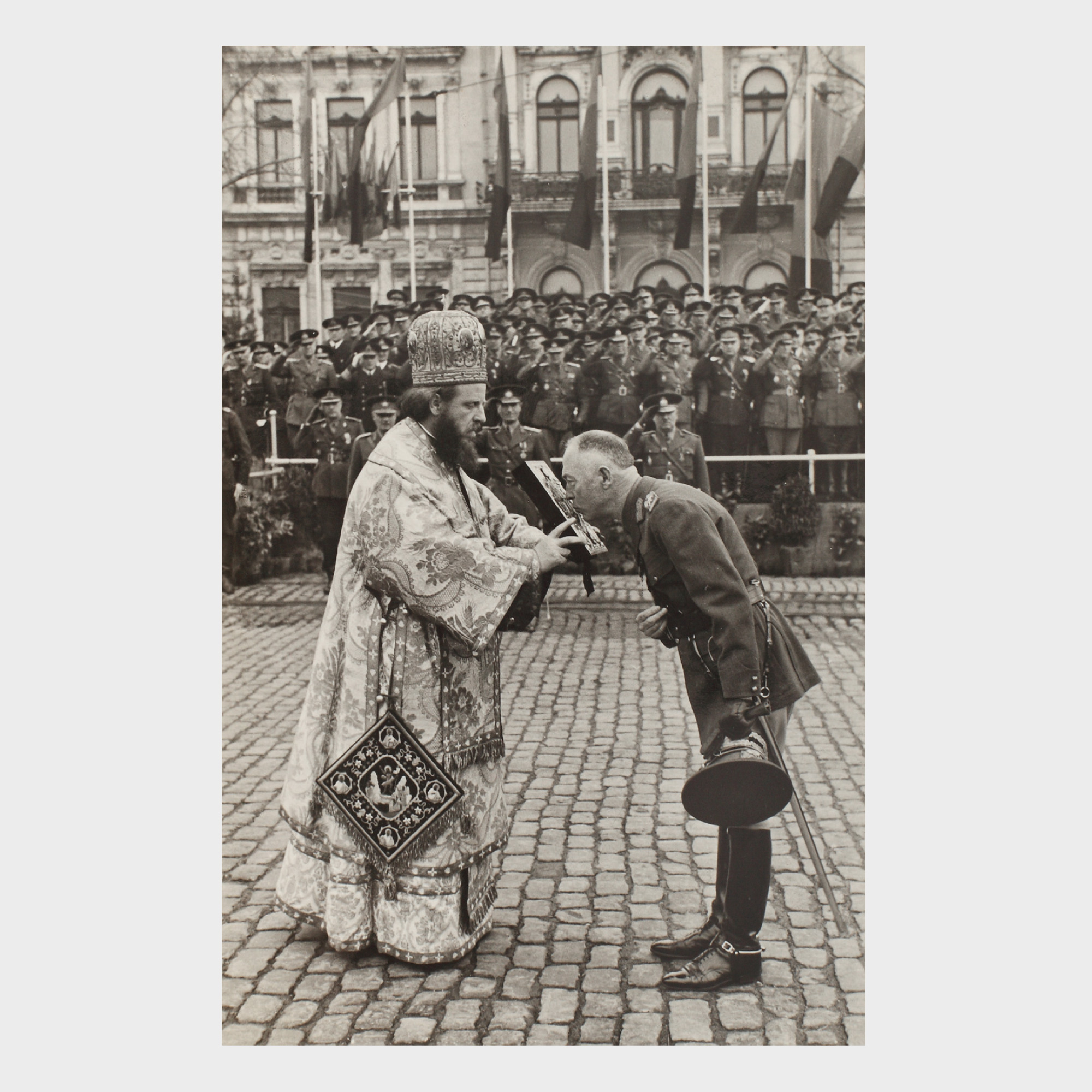 În timpul unei ceremonii militare la care participă numeroși ofițeri superiori ai armatei române, generalul Ion Antonescu participa la slujba religioasă oficiată de P. S. Partenie Ciopron, Episcop al Armatei Române.