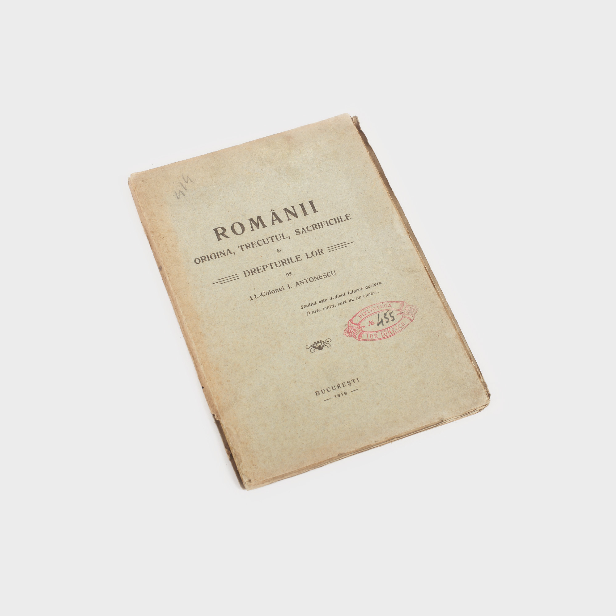 335. Lt.-Colonel I. Antonescu, "Românii. Originea, trecutul, sacrificiile", ediție princeps, București, 1919