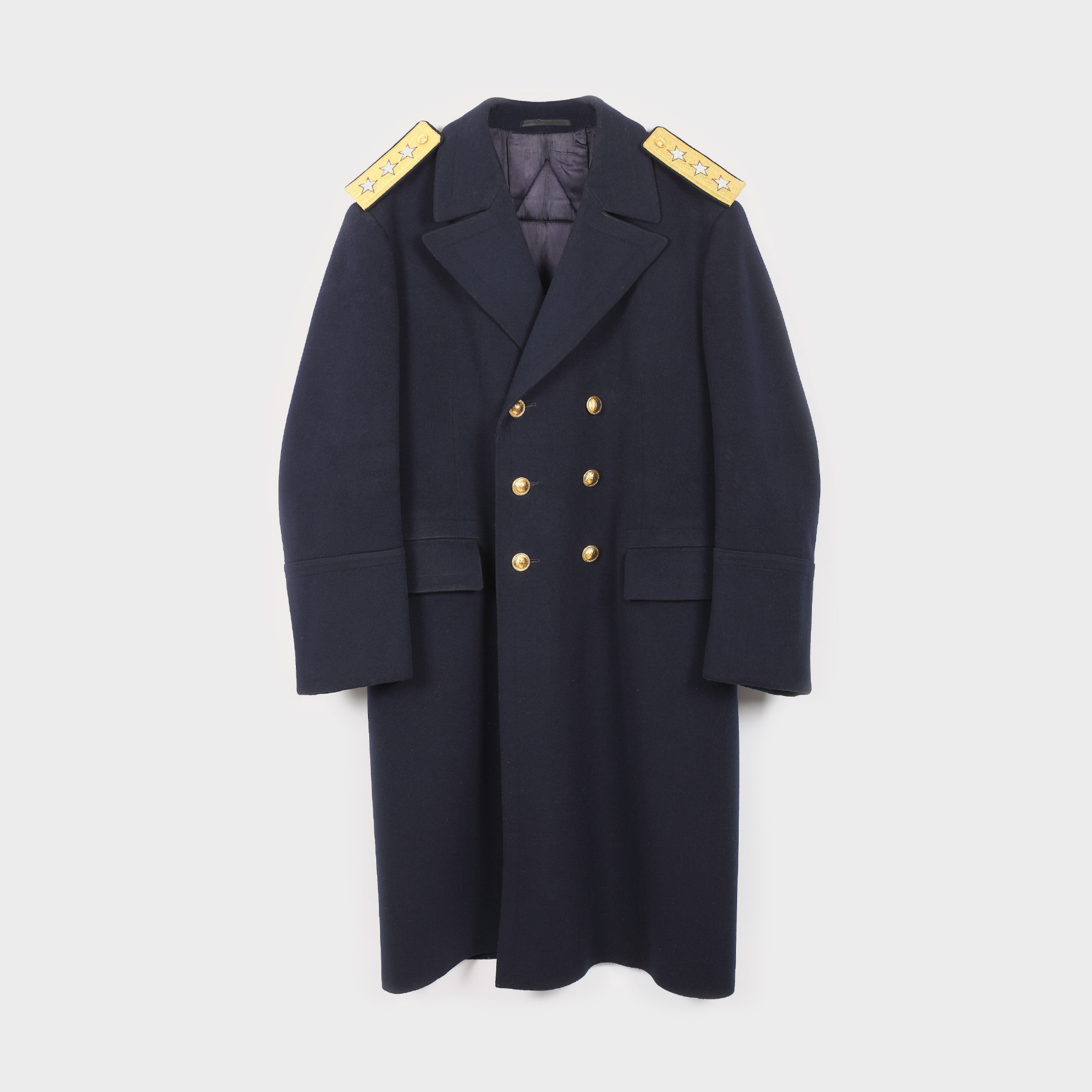 Mantaua făcea parte din uniforma de zi a ofițerilor superiori din marina militară a RSR în grad de viceamiral. Epoleții, realizați din carton îmbrăcat în mătase brodată cu fir, susțin cele trei stele care ilustrează gradul militar. Piesa este confecționată din postav gros, de bună calitate, cu nasturi din alamă decorați cu simbolul ancorei.
