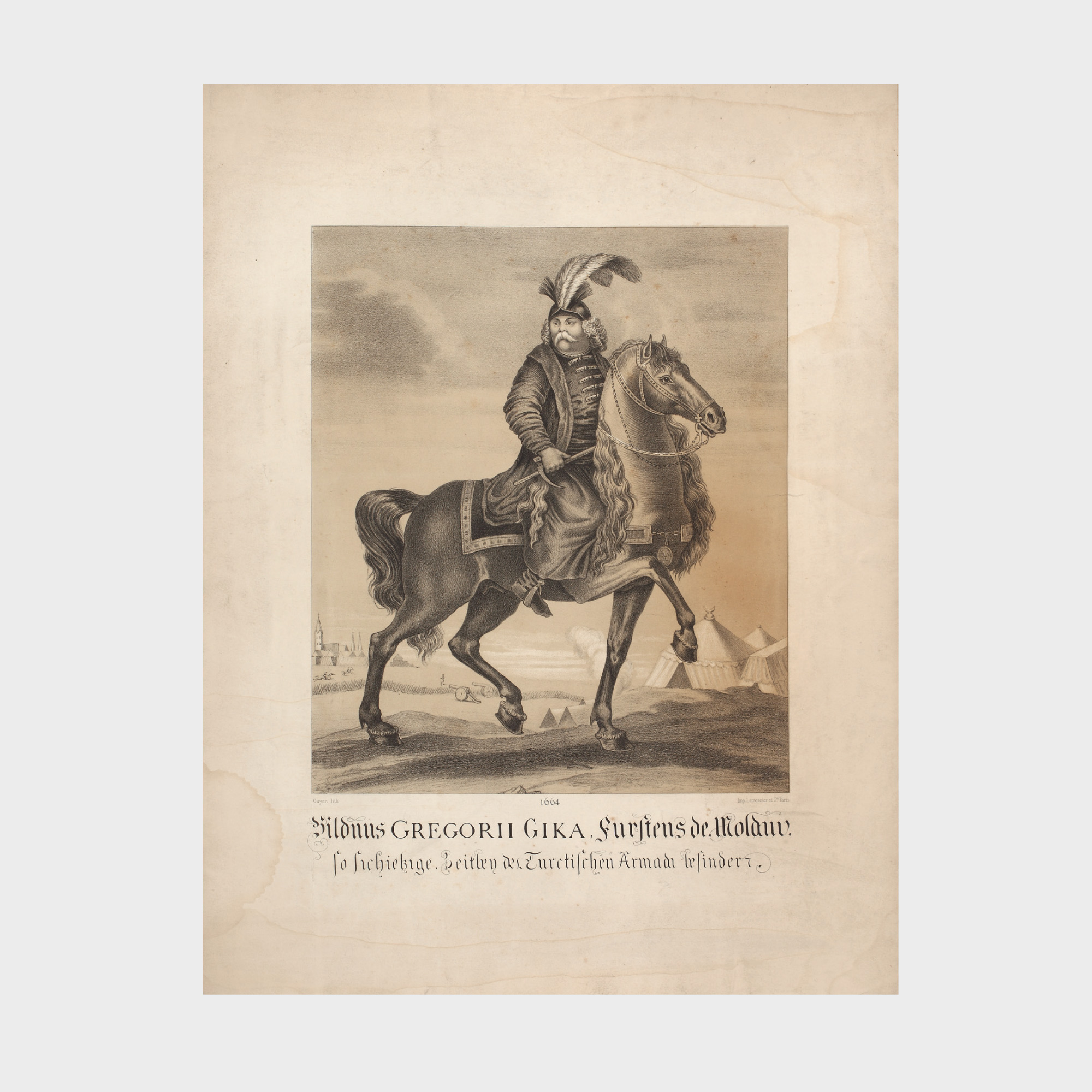 Grigore I Ghica (1660-1664; 1672-1673) a domnit în Țara Românească într-o perioadă caracterizată prin dese schimbări de domni datorate luptei pentru putere dintre familiile boierești. Aliat la început cu postelnicul Constantin Cantacuzino, s-a întors apoi împotriva acestei familii pe care a persecutat-o. Portretul de față ilustrează ultimul an al primei domnii, un moment în care domnul participă alături de otomani la o campanie militară împotriva Transilvaniei. Autorul lucrării este F. Guyon, litograf francez care realiza portretul domnitorului muntean pe care îl imprima în atelierul deținut de familia Lemercier la Paris în jurul anului 1850. Prim-planul litografiei este marcat de domnitor, călare și în mână cu un ciocan de luptă, iar în plan secund se pot distinge corturile taberei otomane desfășurate în fața unui oraș transilvănean. În partea de jos se poate citi legenda: "1664/Bildnus GREGORII GIKA, Furstens de Moldaw". Litograful face o confuzie între Muntenia și Moldova.