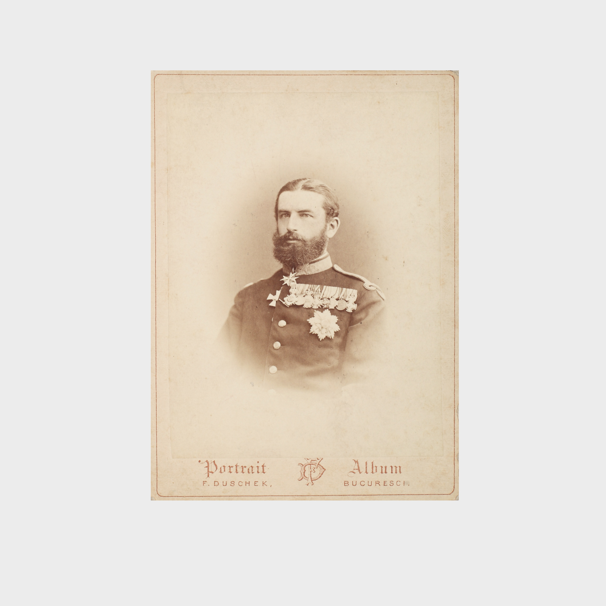 Fotograful Franz Duschek (1830-1884), cumnatul lui Carol Popp de Szathmari, a obținut și el statutul de "fotograf al curții" Regelui Carol I, pe care l-a portretizat în câteva rânduri. Fotografia este lipită de un carton de epocă, în partea inferioară cu mențiunea atelierului și sigla fotografului.