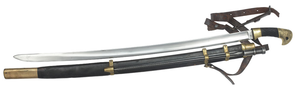 Armata sovietică a păstrat, cel puțin în peri- oada interbelică, unele dintre armele fostei armate imperiale ruse. Printre acestea, și săbiile folosite de ofițerii și soldații trupelor de cazaci. Piesa de față prezintă un interesant sistem de prindere pentru baioneta carabinei Mosin-Nagant, model 1895, cu dulie și patru muchii, care se atașa în lateral cu ajutorul celor trei inele din bronz. Harnașamentul format din mai multe curele de piele, permitea purtarea sabiei în diagonală pe după umăr, și nu la centură.