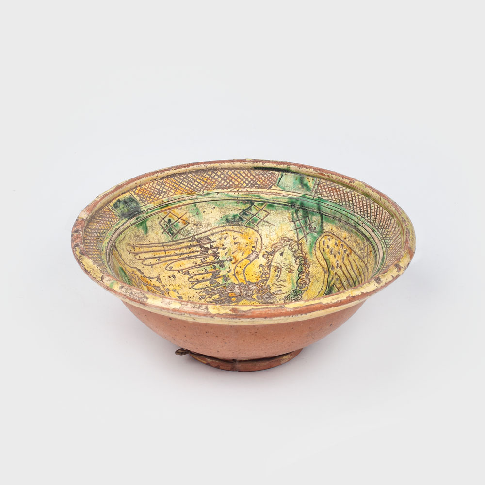 Mai rar în iconografia perioadei, motivul Arhanghelului Mihail care decorează interiorul vasului individualizează piesa. Calitatea superioară a execuției este subliniată și de cromatica realizată în tonuri de galben și verde.