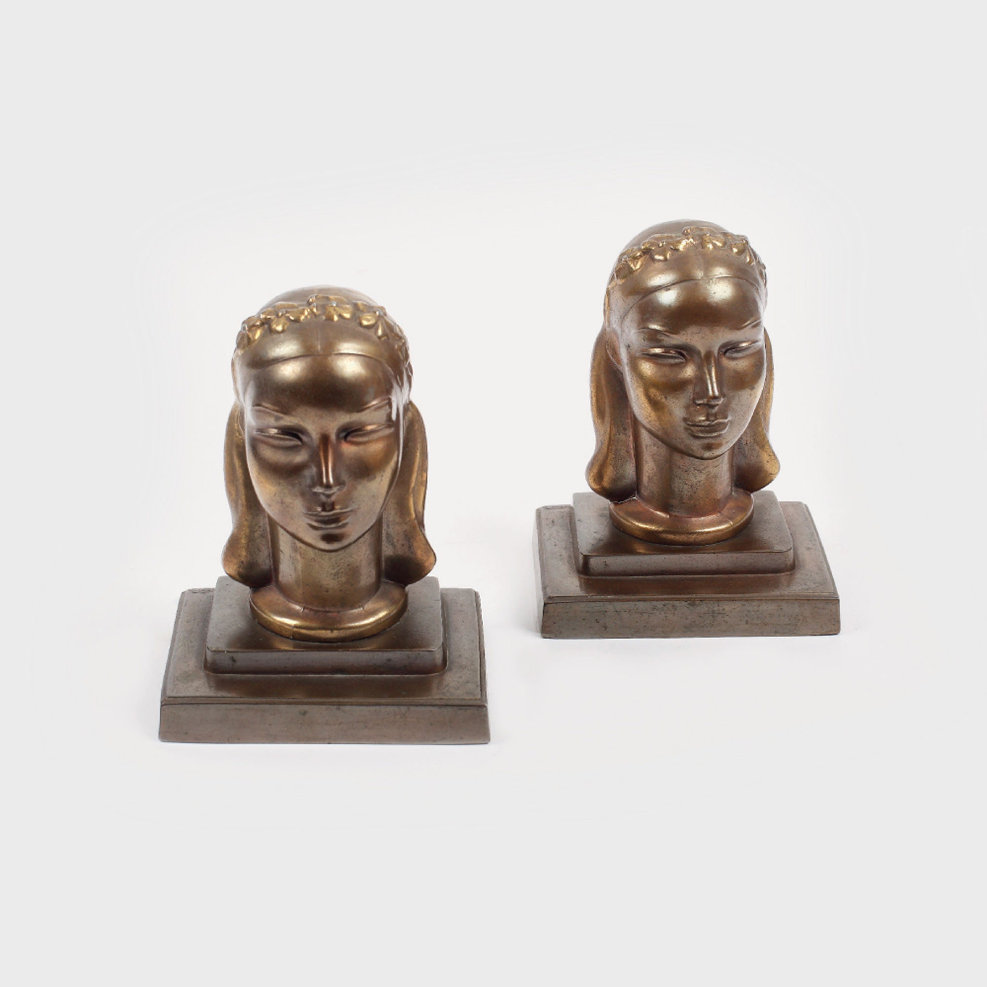 Pereche de statuete reprezentând capete de tinere, cu cununi de flori, reprezentând suporturi pentru cărți.