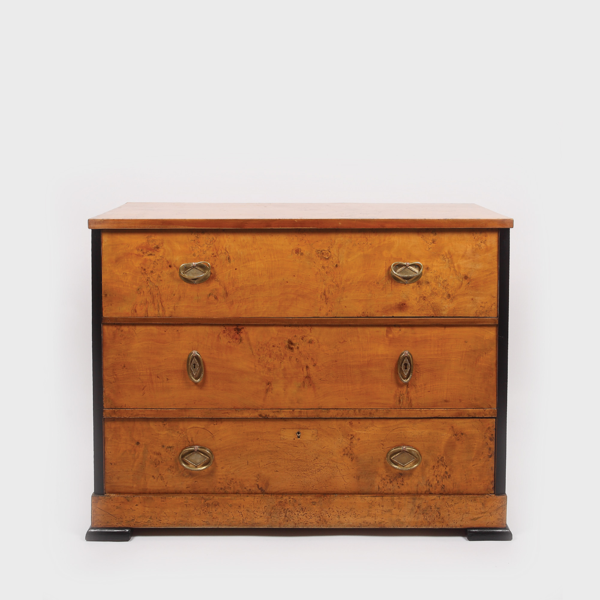 Comodă cu trei sertare, mânere şi plăcuţe din alamă; plintă şi montanţi vopsiţi negru.