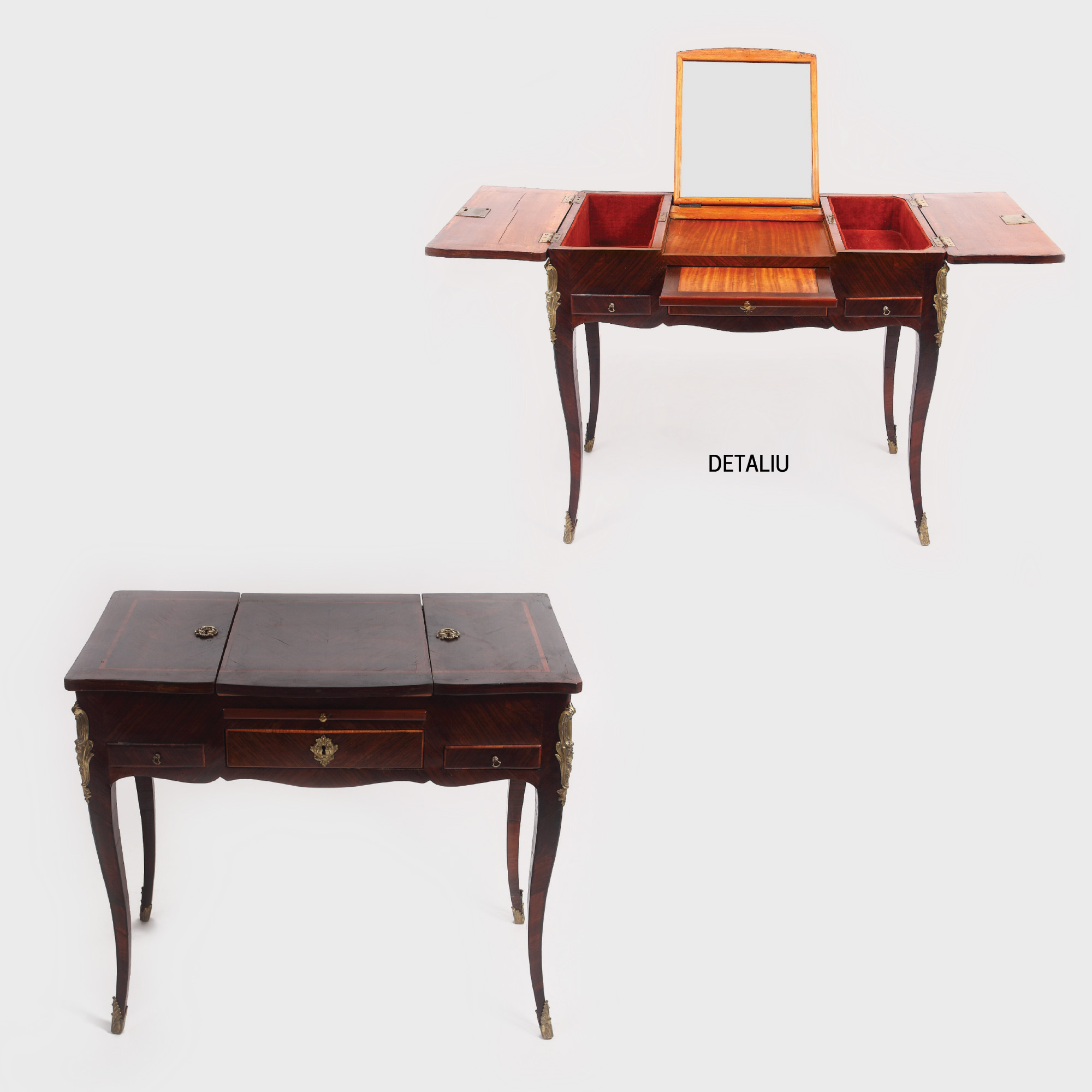 Măsuță de toaletă în stil Louis XV, cu picioare galbate, decorate cu aplicații din bronz, cu sertare laterale la centură, cu blat central rabatabil. Blatul este constituit din trei partiții, lateralele ascund casete pentru bijuterii tapetate cu pluș de mătase, iar central compartiment cu oglindă. Restaurări ample. Piesa este ștampilată "Chevallier".