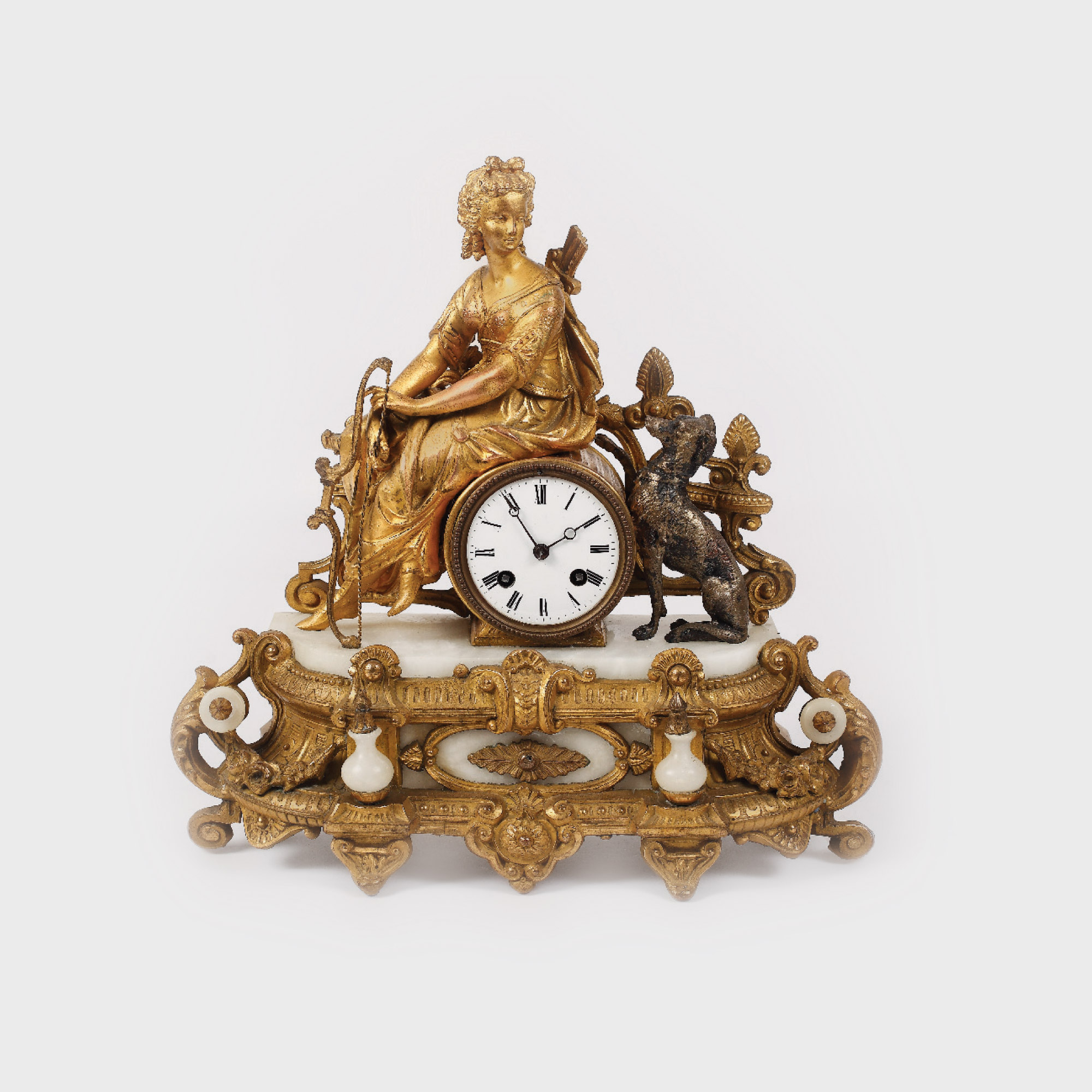 Ceas de șemineu cu cadran surmontat de personaj feminin - Diana, zeița vânătorii, șezând, cu câine de vânătoare, arc și tolbă cu săgeți. Baza și ornamentele realizate din onix sunt îmbrăcate și decorate cu bronz. Mecanism Japy Freres & Cie Grand Medaille D'Honneur (Expo Universellle Paris 1855)