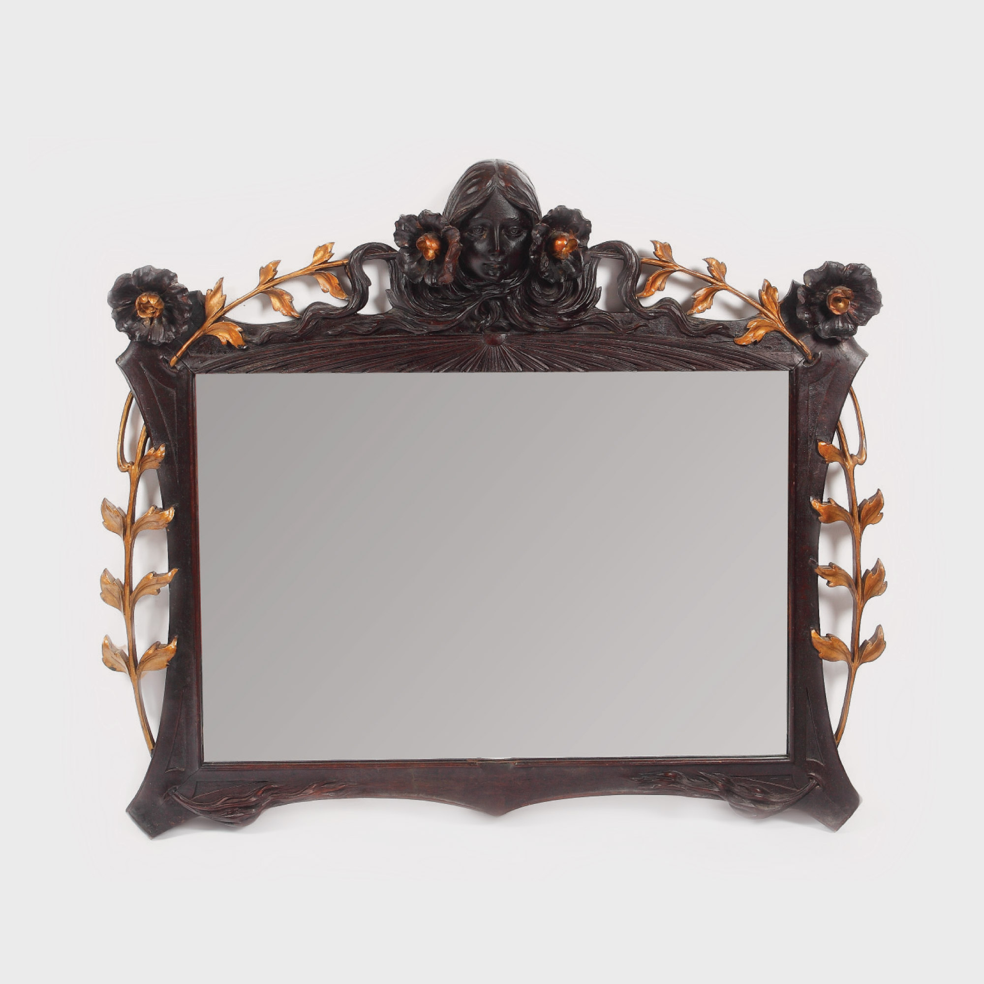 Oglindă dreptunghiulară cu ramă bogat decorată cu vrejuri vegetale, flori mari, surmontată de efigie feminină. În stil Art Nouveau.