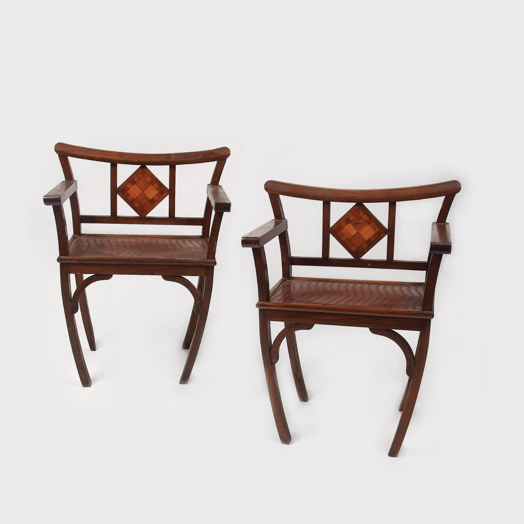 Banchete cu picioare arcuite în interior, şezutul incizat cu striaţii, cotiere drepte, spătar cu medalion pătrat parchetat. Stil Art Deco.