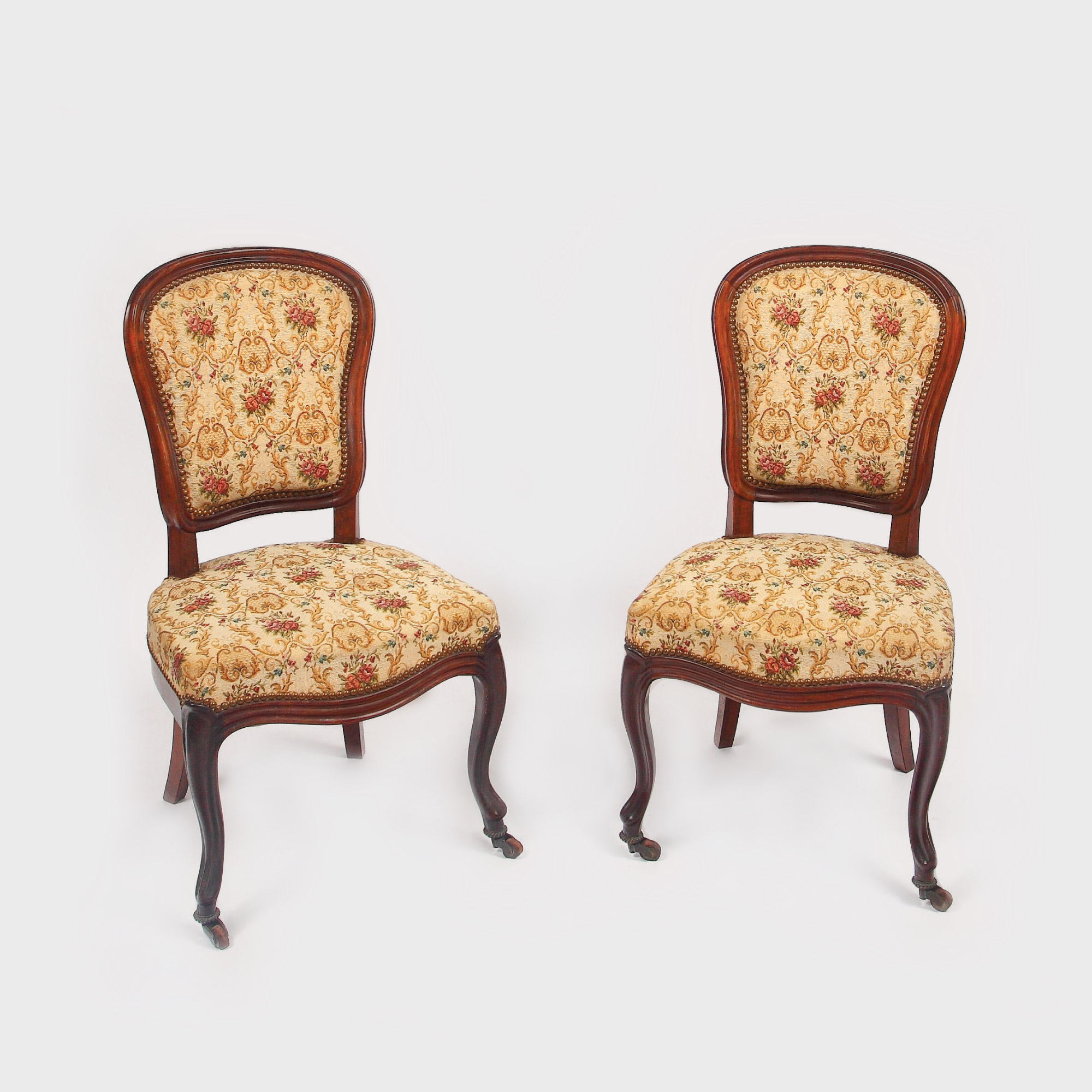 Pereche de scaune de salon, în stil Victorian, cu picioare galbate terminate cu rotile, cu tapițerie recentă din catifea coupé, cu romburi și motive vegetale.