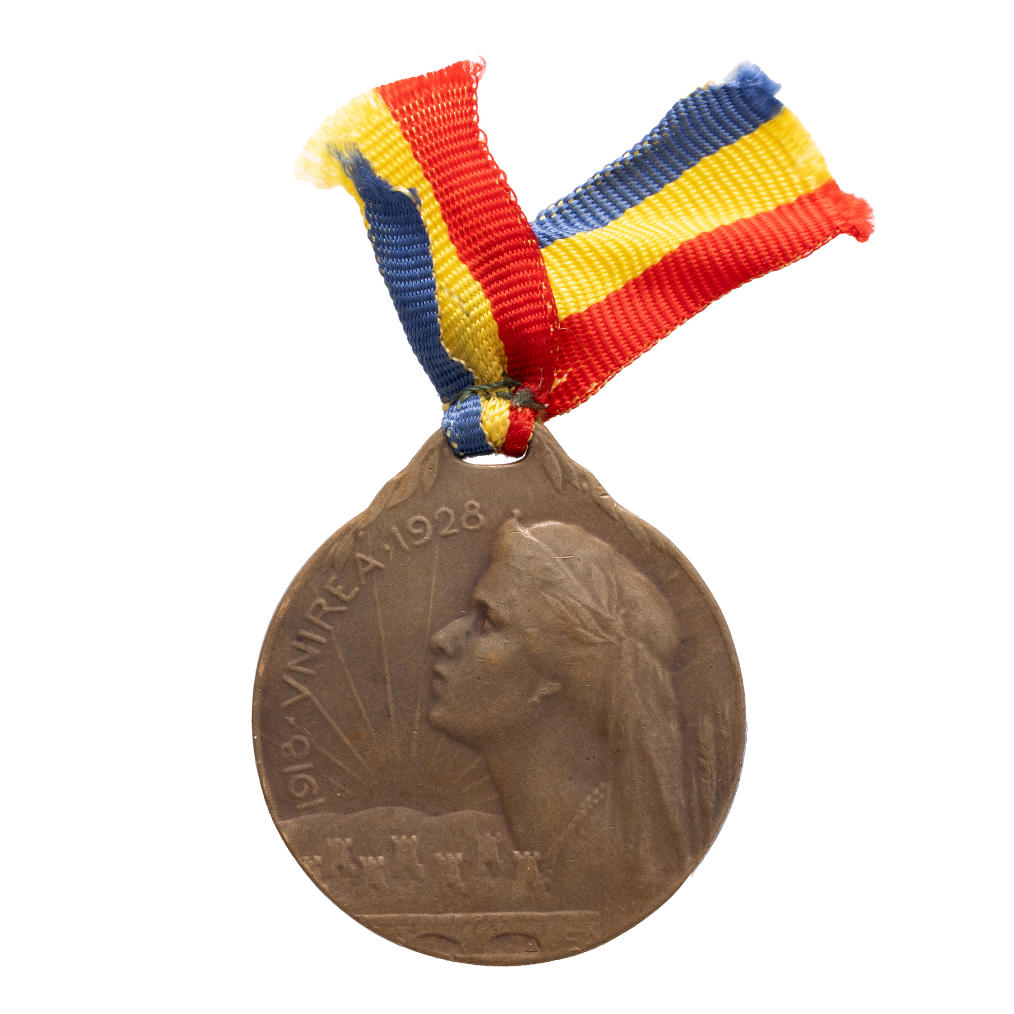 42. Medalion realizat cu ocazia serbărilor ”10 ani de la Unirea din 1918”, gravor Pierre-Victor Dautel, 1928