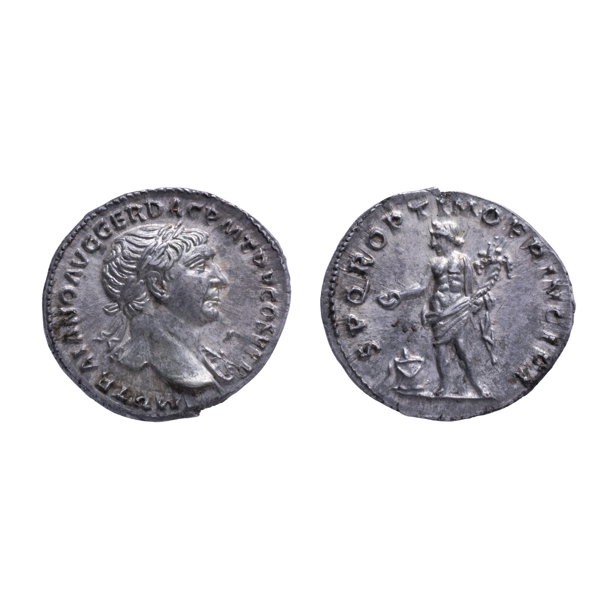 73C. Monedă Denarius, Traian, tip Genius cu patera și cornucopia, 106-107 e.n., argint