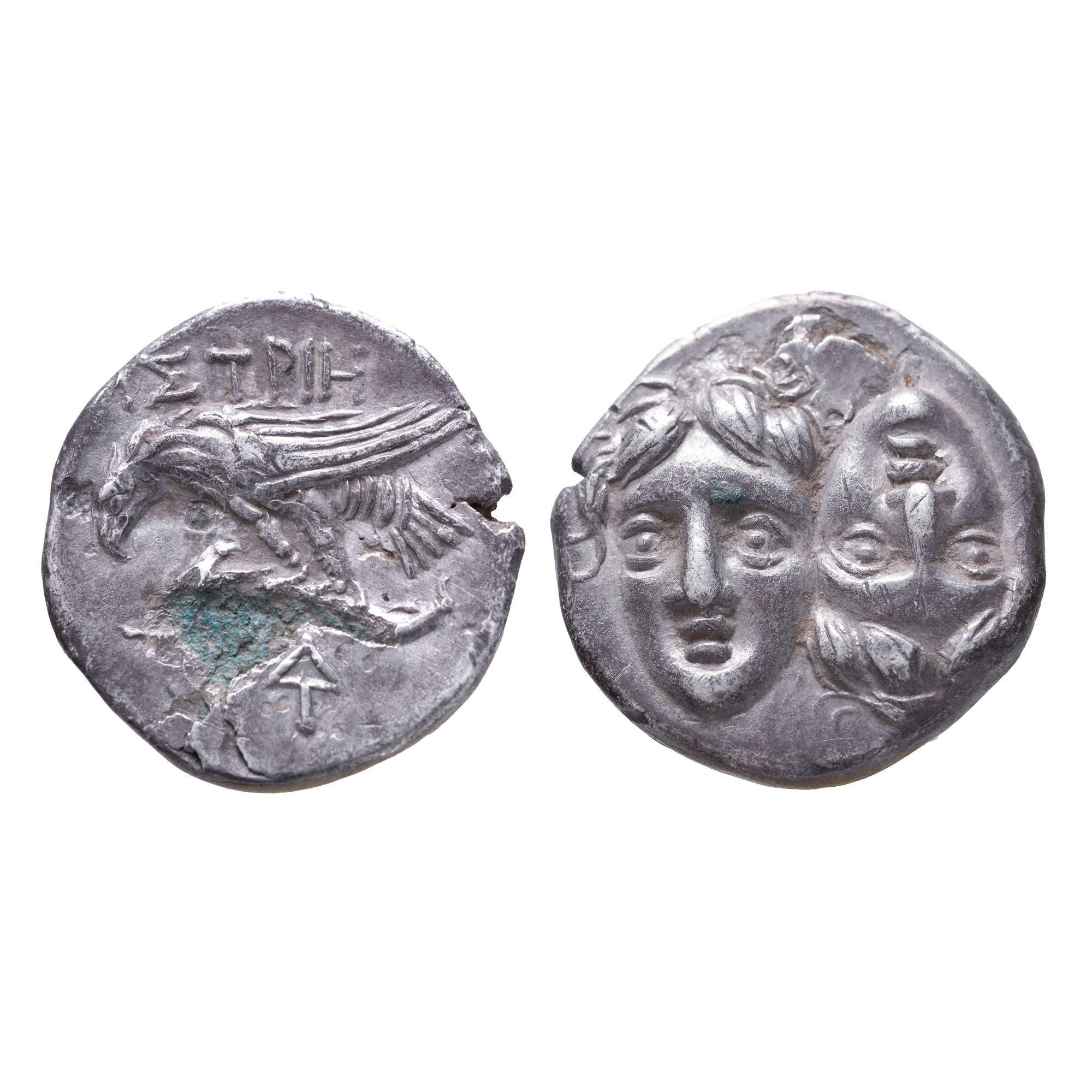 52C. Monedă Drahmă, tip Gemenii - cele două fețe ale Dunării, Histria, 434-300 î.e.n., prima monedă bătută pe teritoriul actual al României, argint