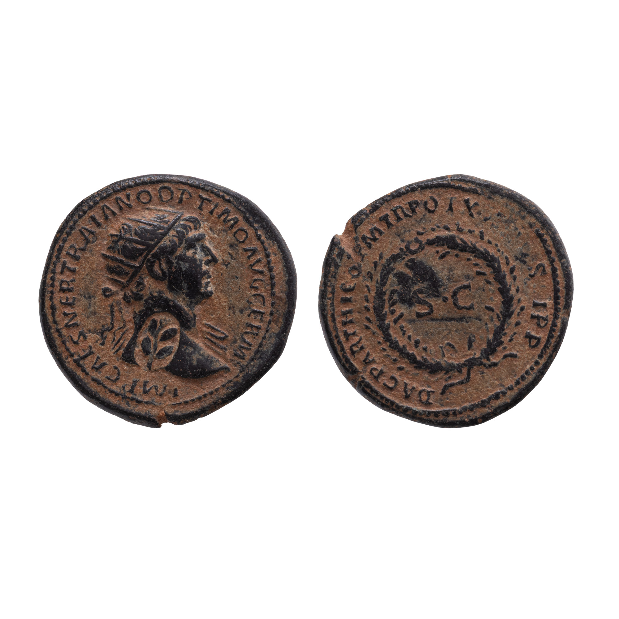 69C. Monedă Semis, Traian, bătută în Antiohia pentru a circula în Siria, 114-117 e.n.