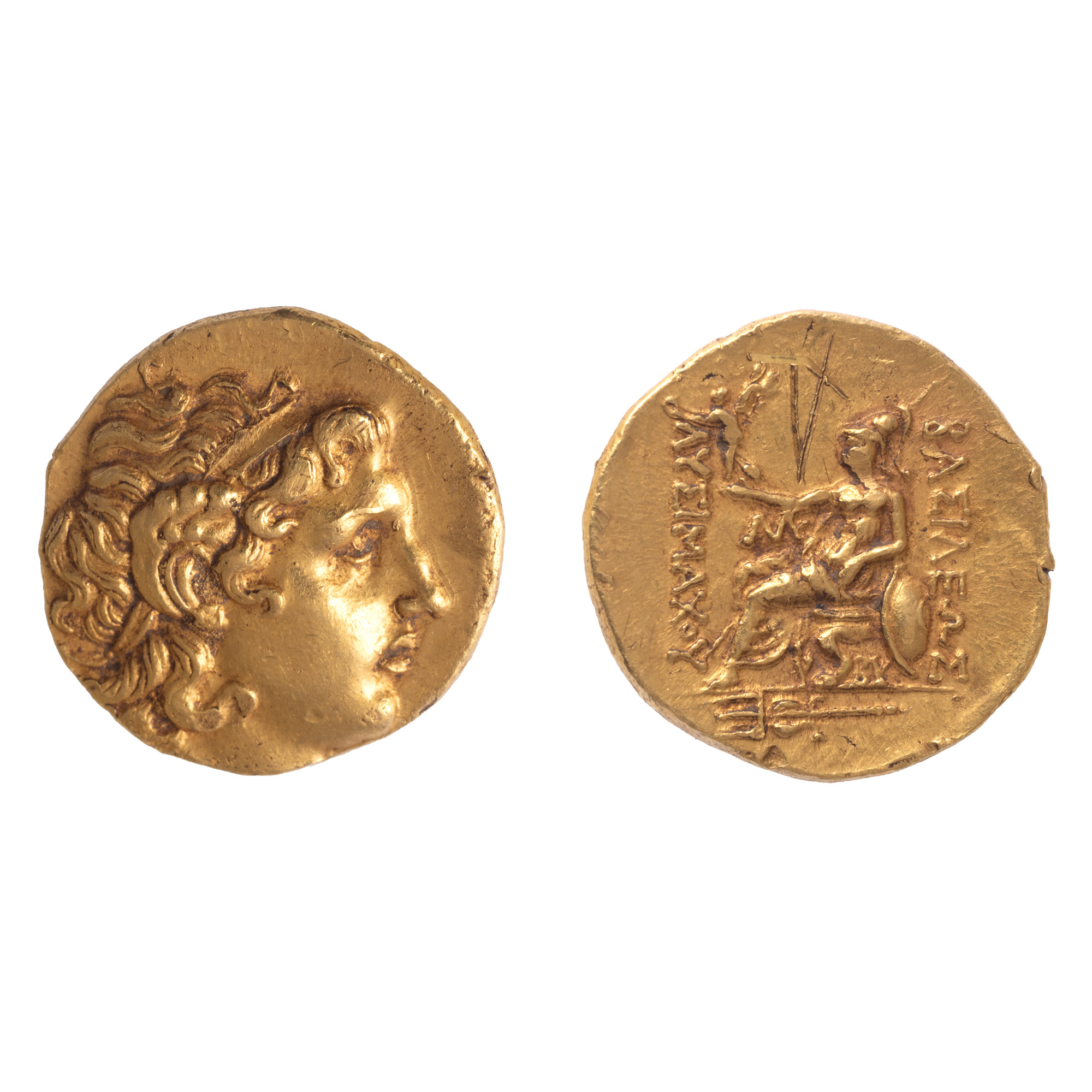 Monedele de tip Stater, în numele lui Lysimachos, bătute postum reprezintă o categorie deosebit de importantă de artefacte monetare, atât din punct de vedere istoric, cât și arheologic. Deși regele Lysimachos a domnit în perioada 306–281 î.Hr., numele său a continuat să fie folosit pe monedele emise mult după moartea sa, ceea ce indică prestigiul durabil al figurii sale politice și militare în lumea elenistică. Aceste monede, de inspirație macedoneană, se disting prin iconografia specifică: pe avers apare portretul idealizat al lui Alexandru cel Mare (cu trăsături divinizate, purtând coarne de berbec, asociate cu zeul Ammon), iar pe revers, zeița Atena în poziție sedentară, ținând o victorie (Nike) și o suliță, alături de legenda „ΛΥΣΙΜΑΧΟΥ ΒΑΣΙΛΕΩΣ” (LISIMACOU BASILEOS). Deși bătute la decenii după moartea lui Lysimachos, aceste monede aveau scopul de a conferi încredere în circulația monetară, valorificând o imagine regală recunoscută și respectată. Importanța acestor stateri postumi bate adânc în realitățile economice și comerciale ale epocii. Byzantionul, situat strategic la intersecția rutelor comerciale dintre Marea Egee și Marea Neagră, a emis astfel de monede pentru a susține comerțul internațional și pentru a răspunde cererii de valută puternică în regiune. Aceasta explică și larga lor răspândire, inclusiv în nordul Dunării. Descoperirea acestor monede pe teritoriul actual al României, în special în contexte arheologice din zona Dobrogei și chiar din interiorul arcului carpatic, atestă existența unor legături comerciale și culturale strânse între orașele grecești de pe litoralul pontic și comunitățile locale geto-dacice.