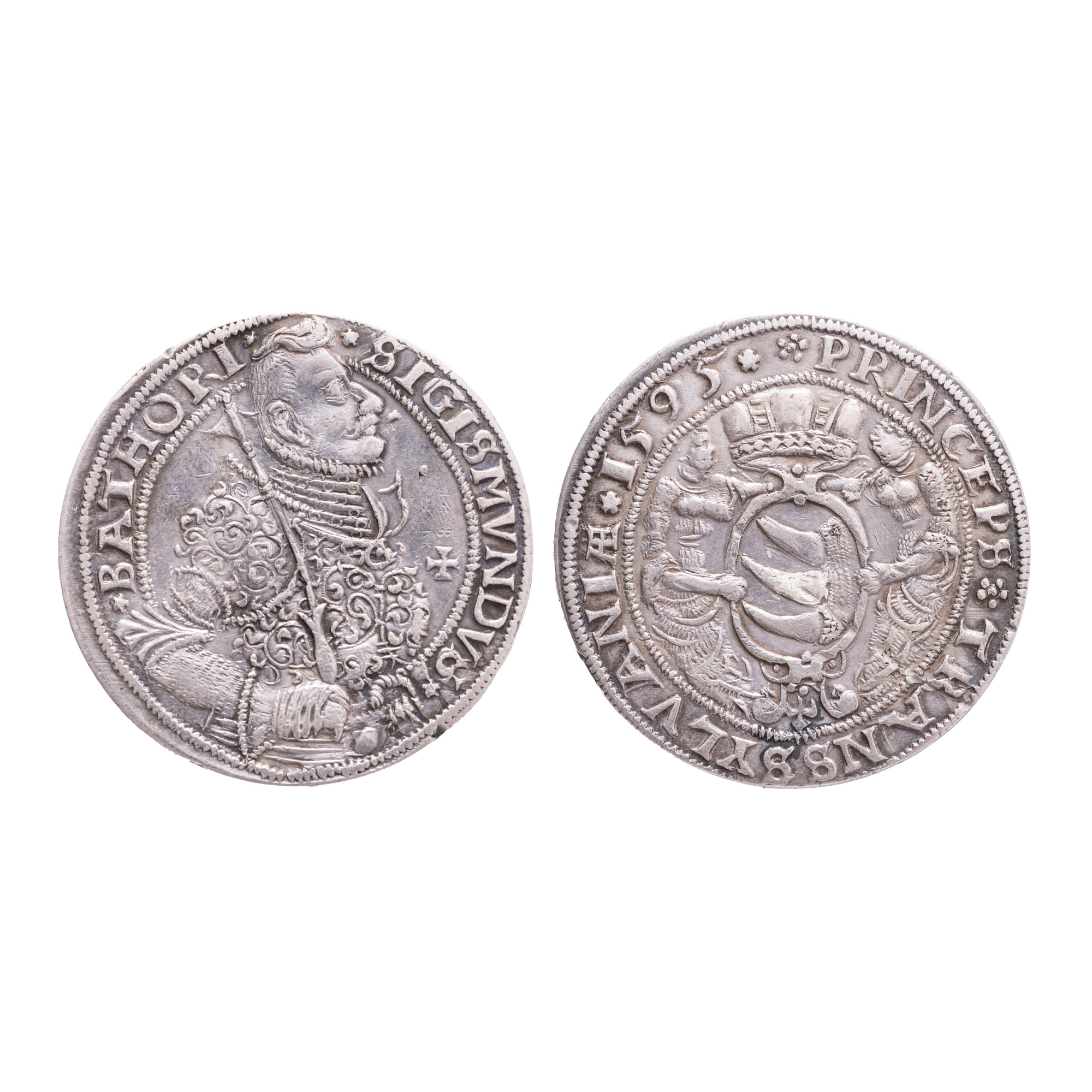 Avers: BATHORI • SIGISMVNDVS, alături de bustul acestuia cu sceptru, orientat spre stânga Revers: PRINCEPS * TRANSSYLVANIA * 1595, alături de stemă. Talerii bătuți sub domnia lui Sigismund Bathory nu doar că reflectau controlul său asupra monetăriilor în Transilvania, ci și promovau stabilitatea economică prin standarde clare de valoare. Aceasta a fost o perioadă în care importanța monedei și a controlului asupra acesteia era crucială pentru orice conducător, iar talerii bătuți au fost o manifestare concretă a acestei autorități economice și politice. Sigismund Báthory joacă un rol esențial în înțelegerea contextului politic al sfârșitului secolului al XVI-lea, mai ales în relația cu Mihai Viteazul, domnitorul Țării Românești. Între cei doi a existat o relație complexă, marcată de alianțe strategice, rivalități și trădări, dar și de momente de cooperare care au influențat decisiv cursul istoriei românești. În contextul luptei împotriva Imperiului Otoman, Sigismund Báthory, principe al Transilvaniei și aliat al Habsburgilor, a căutat să creeze o alianță creștină în Europa de Sud-Est. În acest efort, l-a cooptat pe Mihai Viteazul, care era și el interesat de eliberarea Țării Românești de sub dominația otomană. Astfel, în 1595, între cei doi s-a încheiat o alianță antiotomană, oficializată prin Tratatul de la Alba Iulia, prin care Mihai Viteazul recunoștea suzeranitatea lui Sigismund asupra Țării Românești, în schimbul sprijinului militar. Această alianță a permis desfășurarea campaniilor militare victorioase împotriva otomanilor, culminând cu bătălii importante, precum cea de la Călugăreni (1595), unde Mihai a demonstrat un talent militar remarcabil. Sprijinul oferit de Sigismund – deși uneori ezitant sau insuficient – a fost totuși un factor important în menținerea rezistenței antiotomane în regiune. Relația dintre cei doi s-a deteriorat însă rapid. Sigismund, preocupat de propriile jocuri de putere și influențat de curtea sa nobilă, a început să vadă în Mihai un rival periculos. Drept urmare, alianța s-a destrămat, iar Sigismund a participat la acțiuni ostile împotriva lui Mihai, inclusiv în momentele în care Mihai încerca să consolideze unirea celor trei principate românești – Țara Românească, Transilvania și Moldova. Totuși, chiar și în contextul trădării și al conflictelor, relația dintre Sigismund Báthory și Mihai Viteazul rămâne un punct central în epoca luptei pentru independență și unificare a românilor. Prin alianța lor temporară, s-a creat un precedent istoric important: ideea unei acțiuni militare coordonate între principatele române pentru un ideal comun – independența față de Imperiul Otoman.