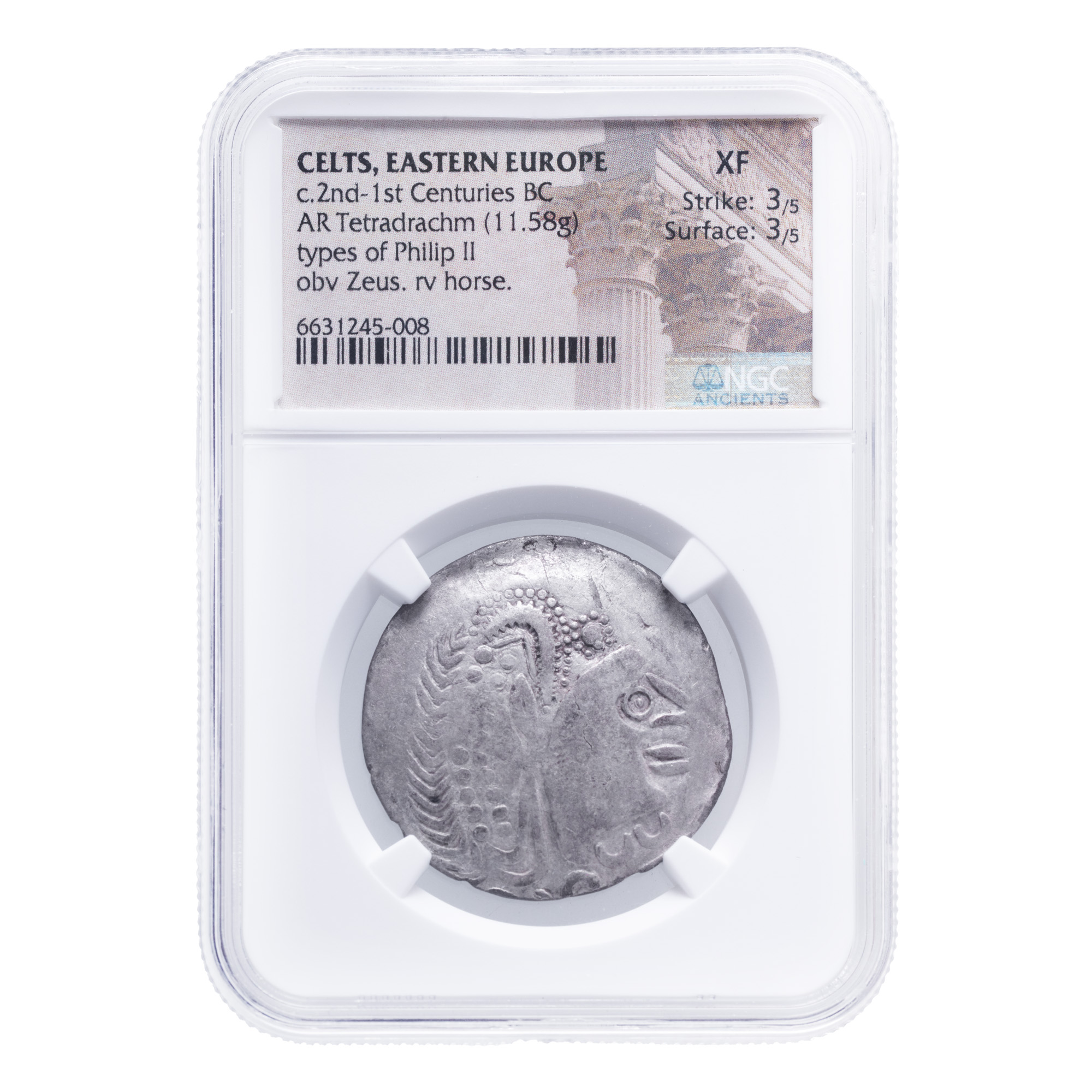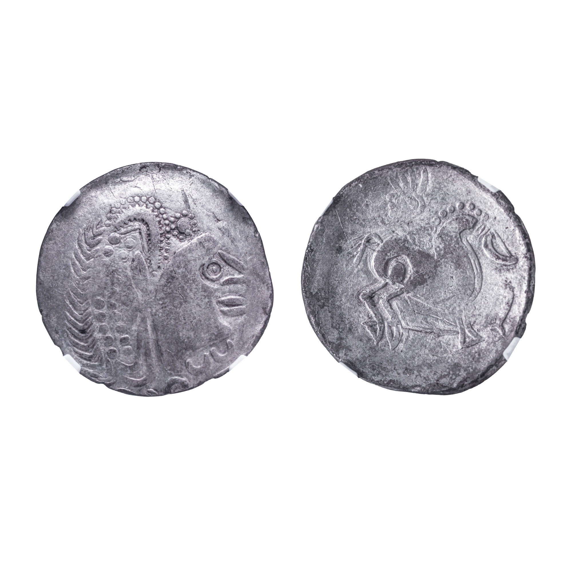 60C. Monedă Tetradrahmă dacică, tip Aiud-Cugir, sec. II-I î.e.n., argint, gradată NGC XF, piesă rară