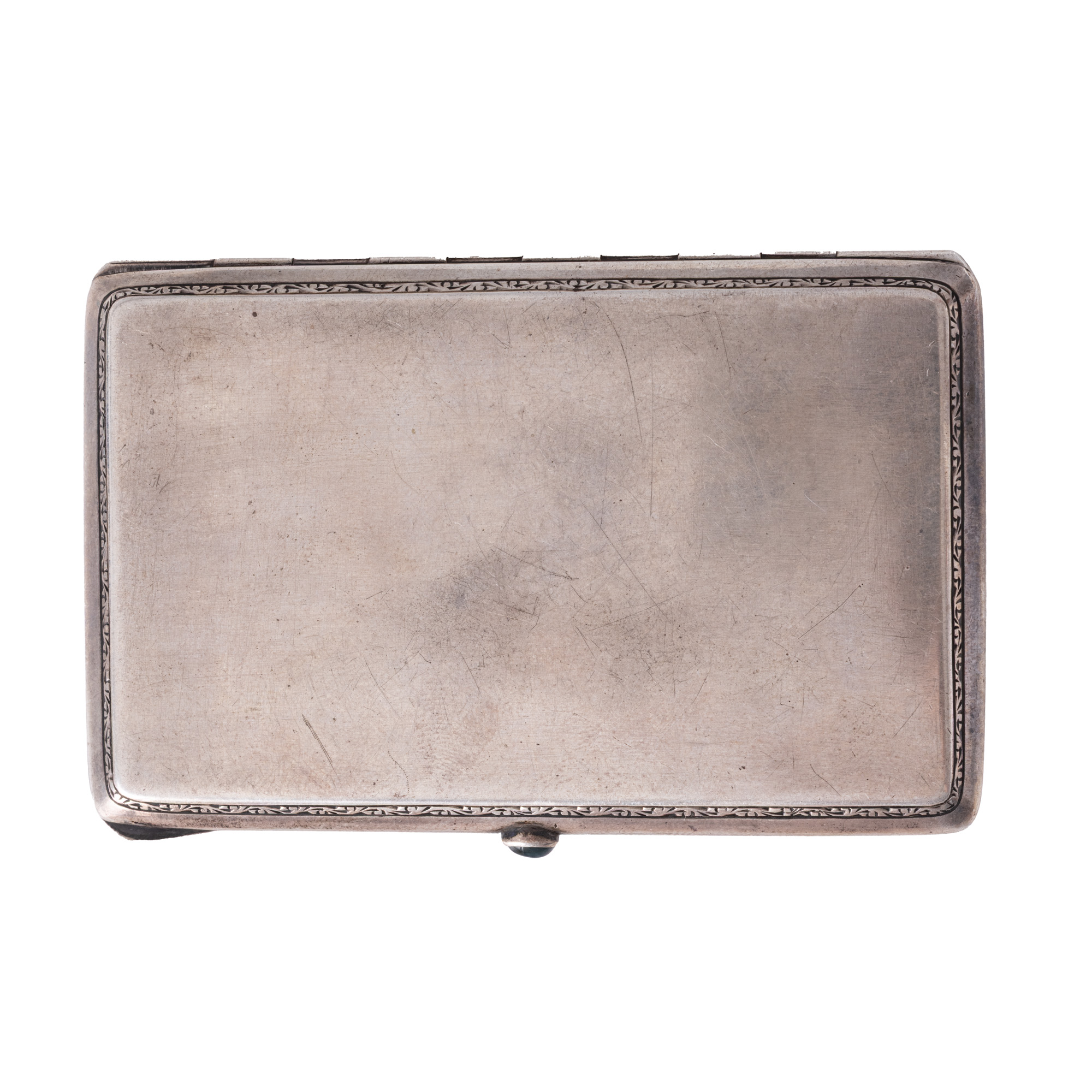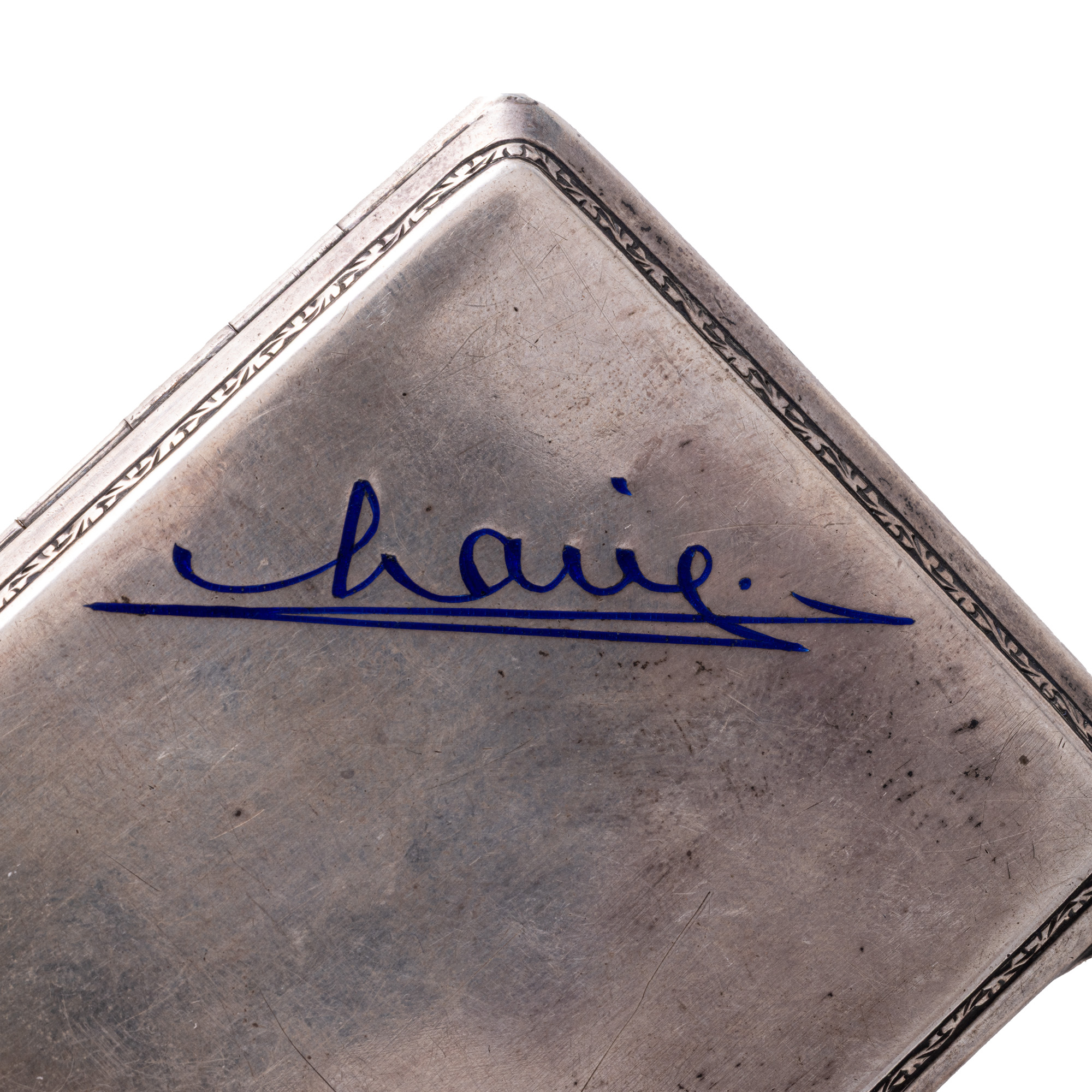 36. Tabacheră din argint, cu buton din safir natural, decorată în email cu semnătura Reginei Maria, probabil cadou de protocol al Reginei, prima jumătate a sec. XX