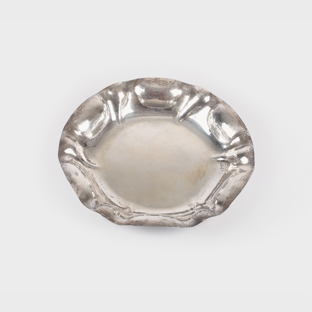 Fructieră pe bază circulară, ce are suprafața lisă, ușor ciocănită și patinată, decorația constând în godroanele și buloanele ce formează bordura piesei, în maniera argintăriei stil Biedermeier.