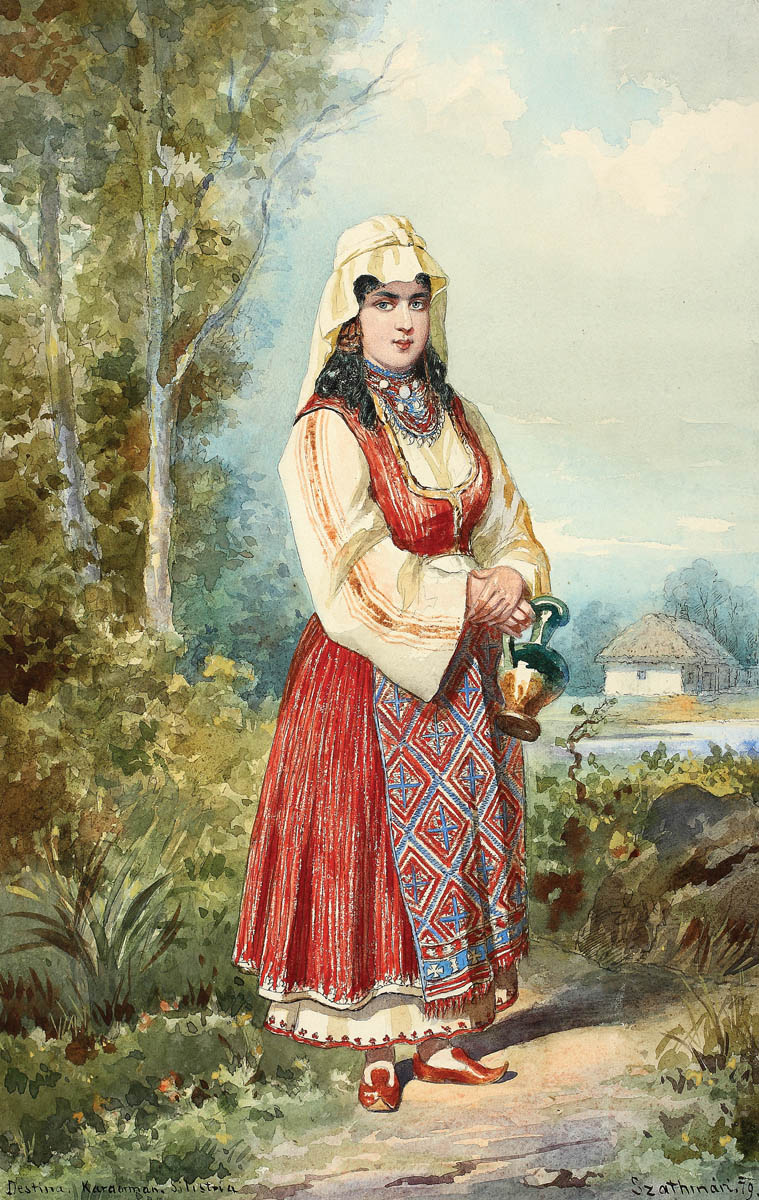 În 1869, principele Carol I, proaspăt urcat pe tron se hotărăşte să-şi prezinte public colecţiile, ‘’dorind astfel să dea un exemplu concetăţenilor… şi să impulsioneze colecţionarea de obiecte cu valoare estetică’’.Prinţului îi plăceau costumele şi ţesăturile populare româneşti şi de aceea îl invitase pe pictorul maltez Amedeo Preziosi să-i facă albume cu acuarele din ţară. Alături de cele ale lui Preziosi erau cele ale lui Carol Szathmari, care ‘‘cam idealizează chipurile ce îmbracă, de altmintrelea, în magnifice costume naţionale’’(V. A. Urechia). Szathmari era pe atunci pictorul şi fotograful Casei princiare a României. Artistul a fost un personaj extrem de important atât la curtea lui Carol I, dar şi la alte curţi ca de pildă cea a Franţei sau a Angliei, unde fusese primit atât de Napoleon al III-lea cât şi de faimoasa împărăteasă Victoria, pentru a le prezenta albumele cu fotografii realizate de el însuşi în aşa numitul Război al Crimeei. În expoziţia organizată în 1864 la Colegiul Sf. Sava, initulat pompos Academie, alături de Theodor Aman numele său fusese cel mai aclamat în gazeta de limbă franceză, unde scria Ulysse de Marsillac. Szathmari a jucat o vreme rolul unui adevărat ferment în Romania. Acuarela ‘’Către izvor’’, realizată în localitatea Silistra, port la Dunăre în nordul actualei Bulgarii, îmbină minuțiozitatea specifică pictorului-călător de a reda portul popular cu veleitățile pictorului. Cu un ochi fotografic, Szathmari reușește să surprindă detaliile și, în același timp, ceva din emoția ‘‘modelului’’, una din țărăncile din zona de influență orientală.