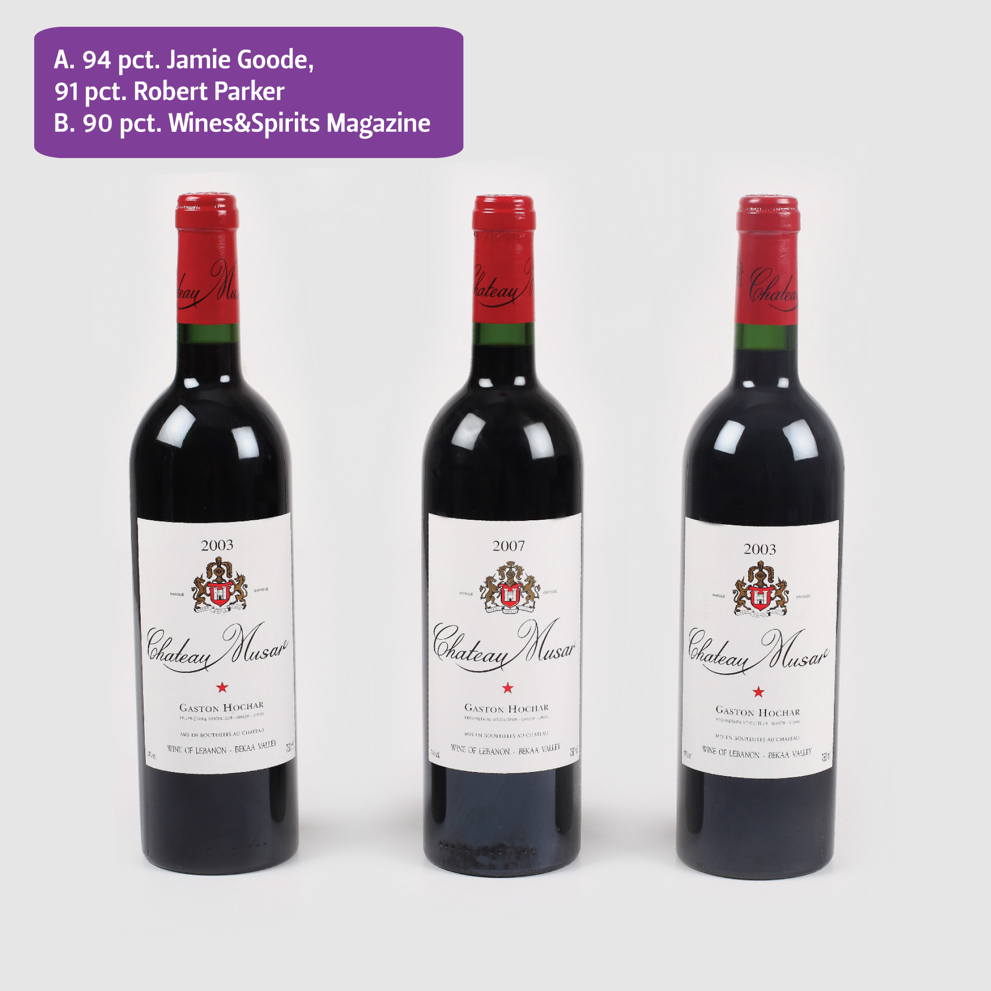 Château Musar este cu siguranță cel mai vechi și mai cunoscut producător din Liban, cu o istorie ce începe în anul 1930. După o lungă ședere în Franța, Gaston Hochar revine în Liban și creează Château Musar în pivnițele castelului Mzar din Ghazir. În 1959, după dobândirea diplomei de ooenolog la Bordeaux, Serge, cel mai mare fiu al lui Gaston, se alătură cramei, iar în 1962 fratele său Ronald preia partea de marketing și financiar, frații primind mână liberă din 1966. Chiar și în timpul războiul din Liban Château Musar a continuat să producă vin, în ciuda condițiilor periculoase. Château Musar este un cupaj care variază la fiecare recoltă, de unde și caracterul diferit și identitatea unică a fiecarui an. 2003 a fost torid, la fel ca în Europa, de unde și caracterul de fruct copt al vinului, dar fără a-i lipsi și puritatea aromelor. 2007 mai are nevoie de câțiva ani în sticlă pentru a deveni expresiv și inconfundabil, cum numai un Musar matur reușește.